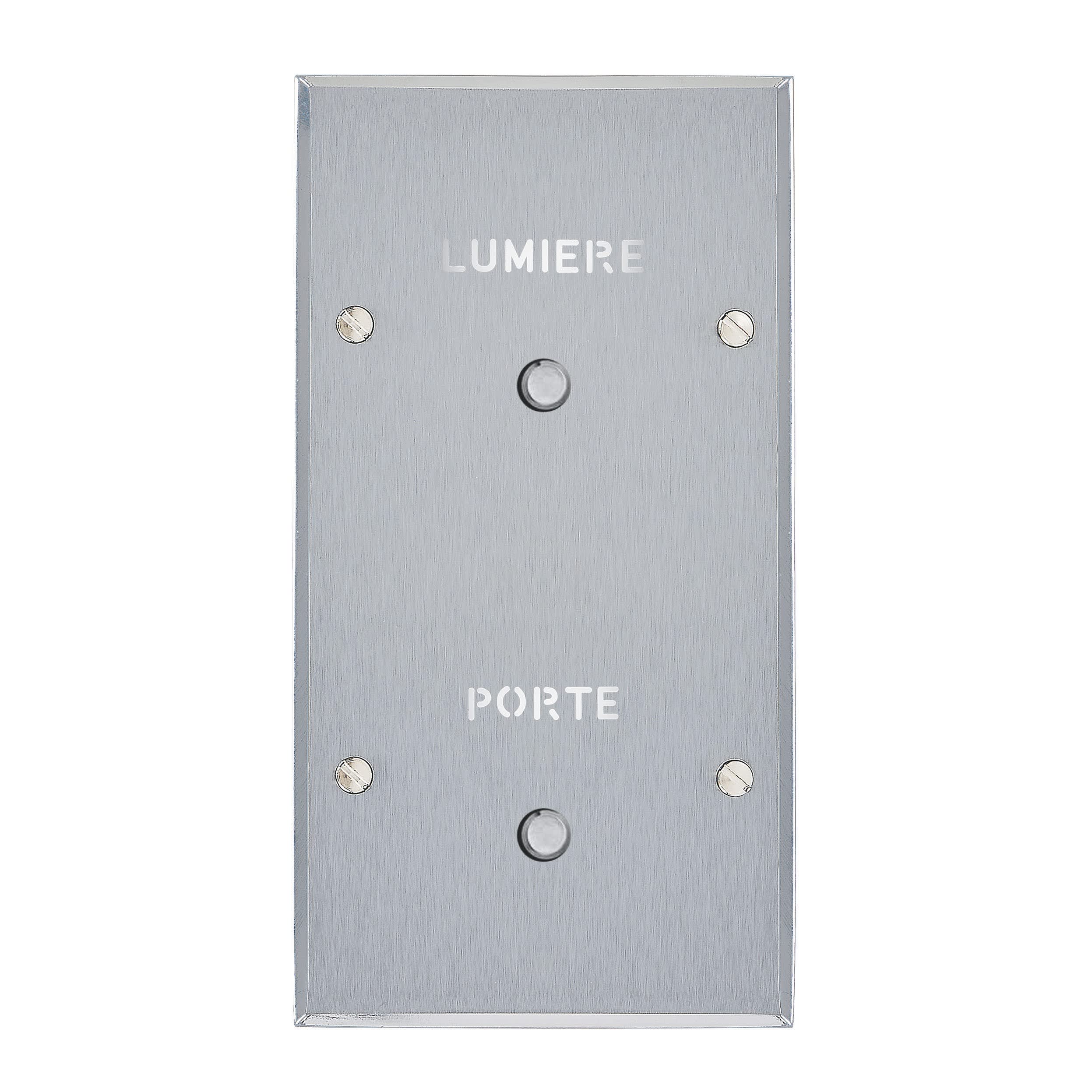 Poussoirs lumineux avec marquages ''Porte'' et ''Lumière'' Art d'Arnould Univers Mémoire Acier brossé Sans collerette Dimensions grand carrée double 80x151mm Se monte dans boîte d'encastrement 2 postes