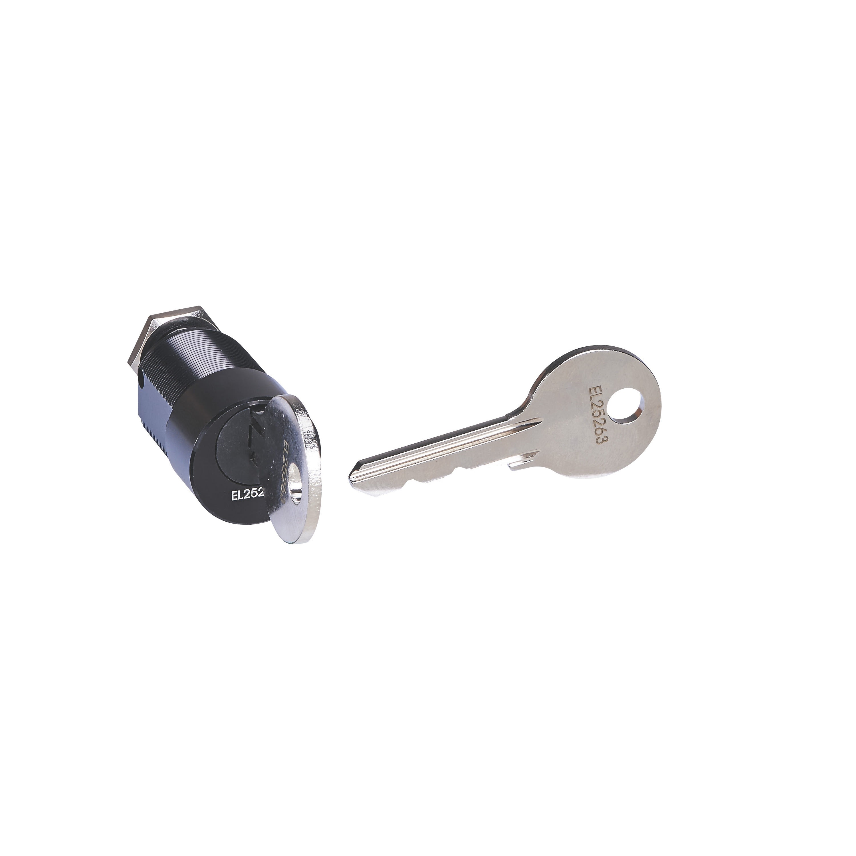Barillet à clé et clé plate avec marquage aléatoire pour verrouillage universel des commandes rotatives, commandes motorisées ou mécanismes débrochables - à associer à une serrure