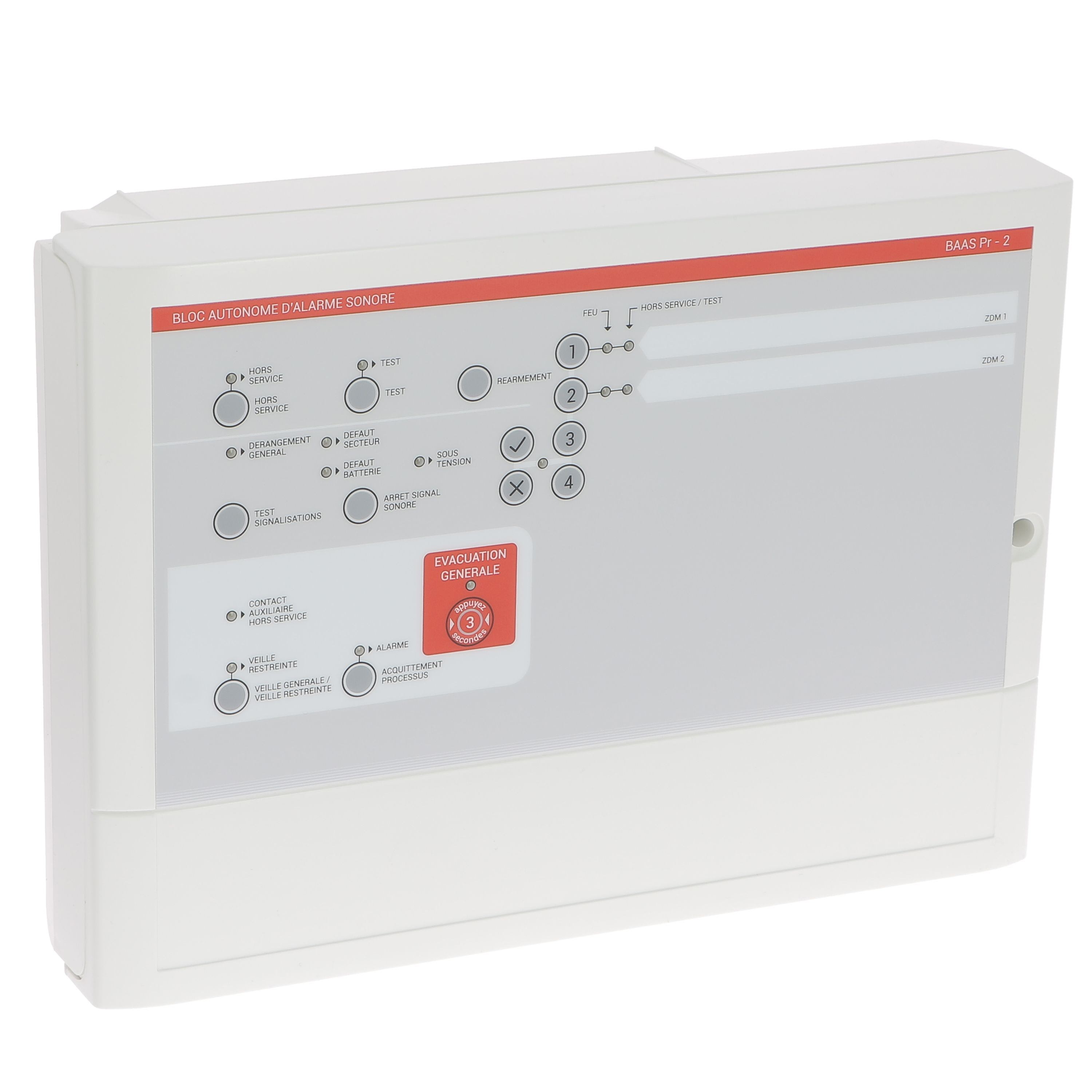 Bloc Autonome d'Alarme Sonore principal (BAAS Pr) tableau d'alarme 2 boucles alimentation 230V~ IP30 IK07 Classe II - 32 déclencheurs manuels maximum par boucle