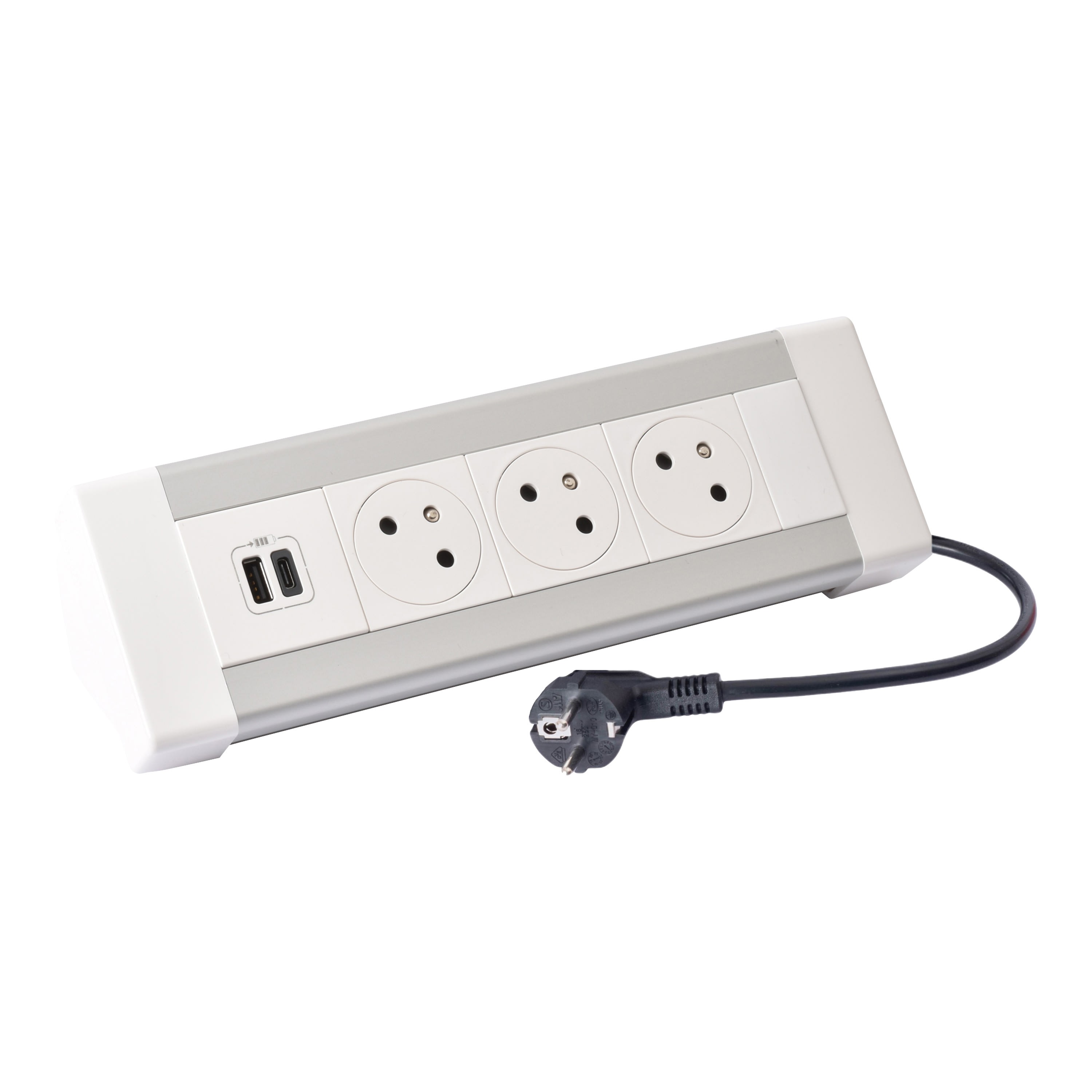 Livré avec cordon H05 VVF 3G 1,5mm² de longueur 3m et une fiche coudée mâle 2P+T noire Bloc bureau avec corps aluminium anodisé et embouts plastique blanc Puissance maximum 3680W en 230V~ par circuit Dimensions :- longueur : 254,5mm- largeur : 90mm- profondeur : 80mm Conforme à la norme NF C 61-314