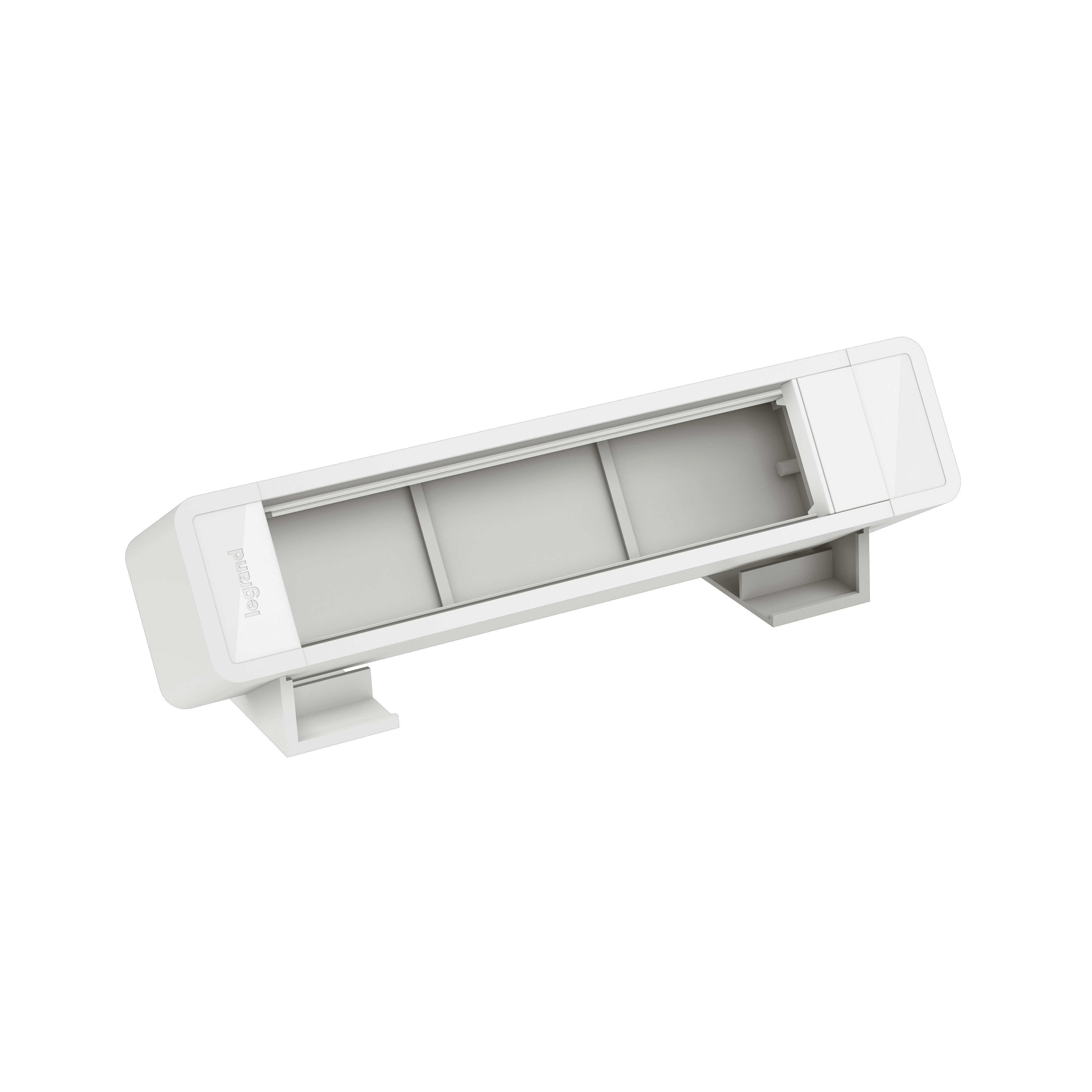 8 modules Cuve aluminium blanc avec fond et embouts ABS blanc À équiper avec des fonctions courant fort ou courant faible Mosaic Peut se fixer au bureau avec la bride de fixation référence 655199 ou les adhésifs double face fourniss