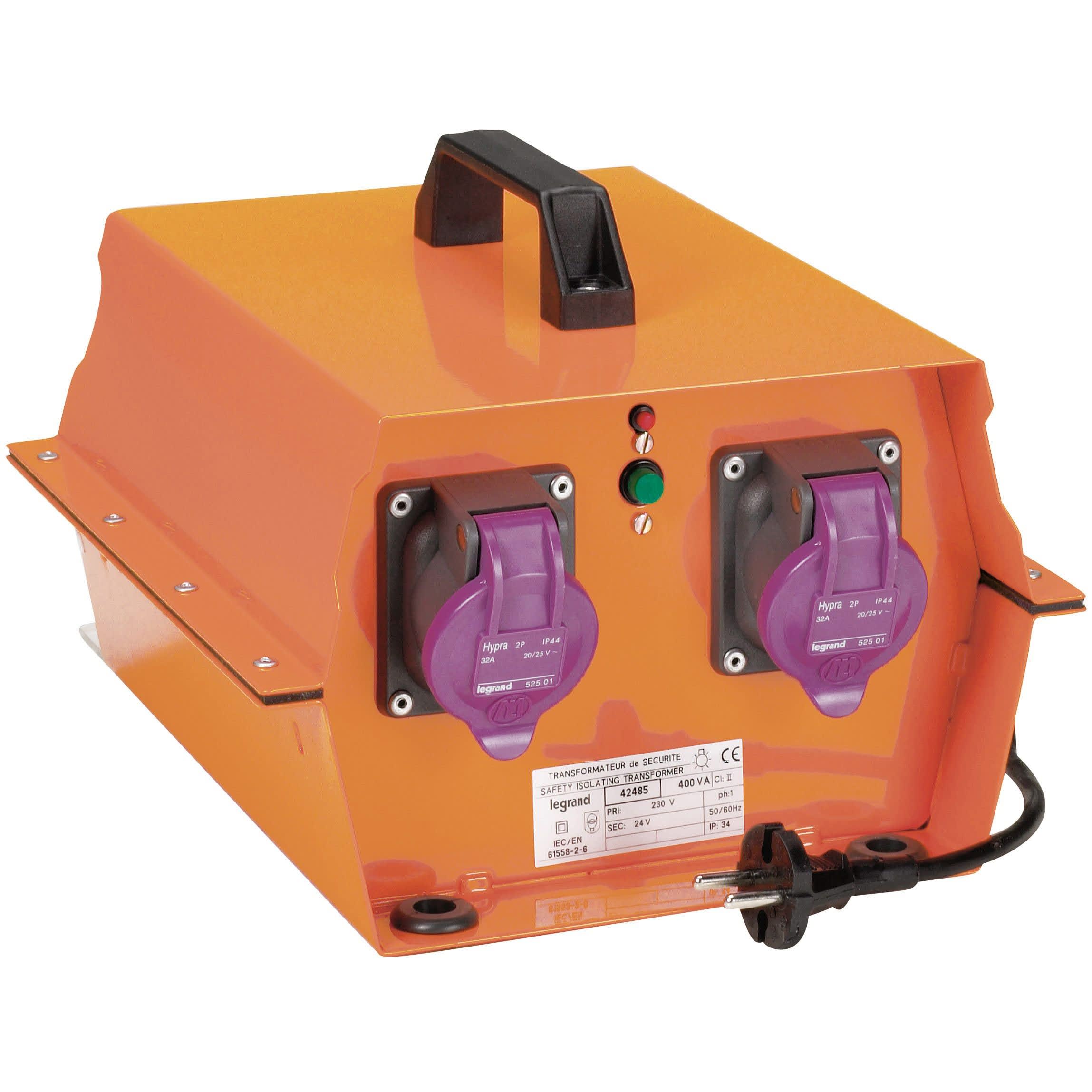 Bloc de sécurité BSM pour fiches Hypra - 400VA - Portatif - IP34 - Classe II - Monobloc - Double isolation Tension isolement entrée/sortie : 3550V - Puissance 400VA - Calibre du disjoncteur unipolaire 18A 230V (primaire) - 24V (secondaire) - Prises de courant : 2 x 32 A Les BS 24 portatifs, équipés de prises à brochage Martin Lunel (référence 0 547 03) et les BSM portatifs, équipés de prises à brochage conforme à la norme IEC 60309-2 (référence 0 524 01 ou 0 525 01) sont des ensembles monoblocs de distribution d'une très basse tension de sécurité (24V) Protection du secondaire du transformateur par disjoncteur magnétothermique - Transfo conforme à la norme IEC EN 61558-2-6, monophasé 50Hz/60Hz - Isolant classe B - Organe de commande marche/arrêt