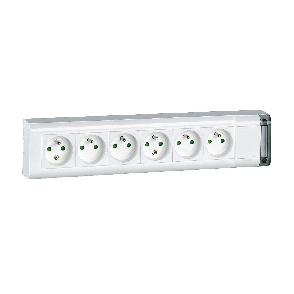 Rallonge multiprise avec 6 prises de courant 2P+T - 16A 230V 3500W Avec éclips de protection pour protection enfant et embout porte-étiquette Livrée avec 3 embouts spéciaux pour association avec moulure 20x12,5mm, 32x12,5mm, 32x16mm et 32x20mm ou tube Ø16mm ou Ø20mm Longueur 343mm - A câbler avec câble souple 3G 1,5mm² recommandé Livré sous blister avec Gencod - Finition blanc