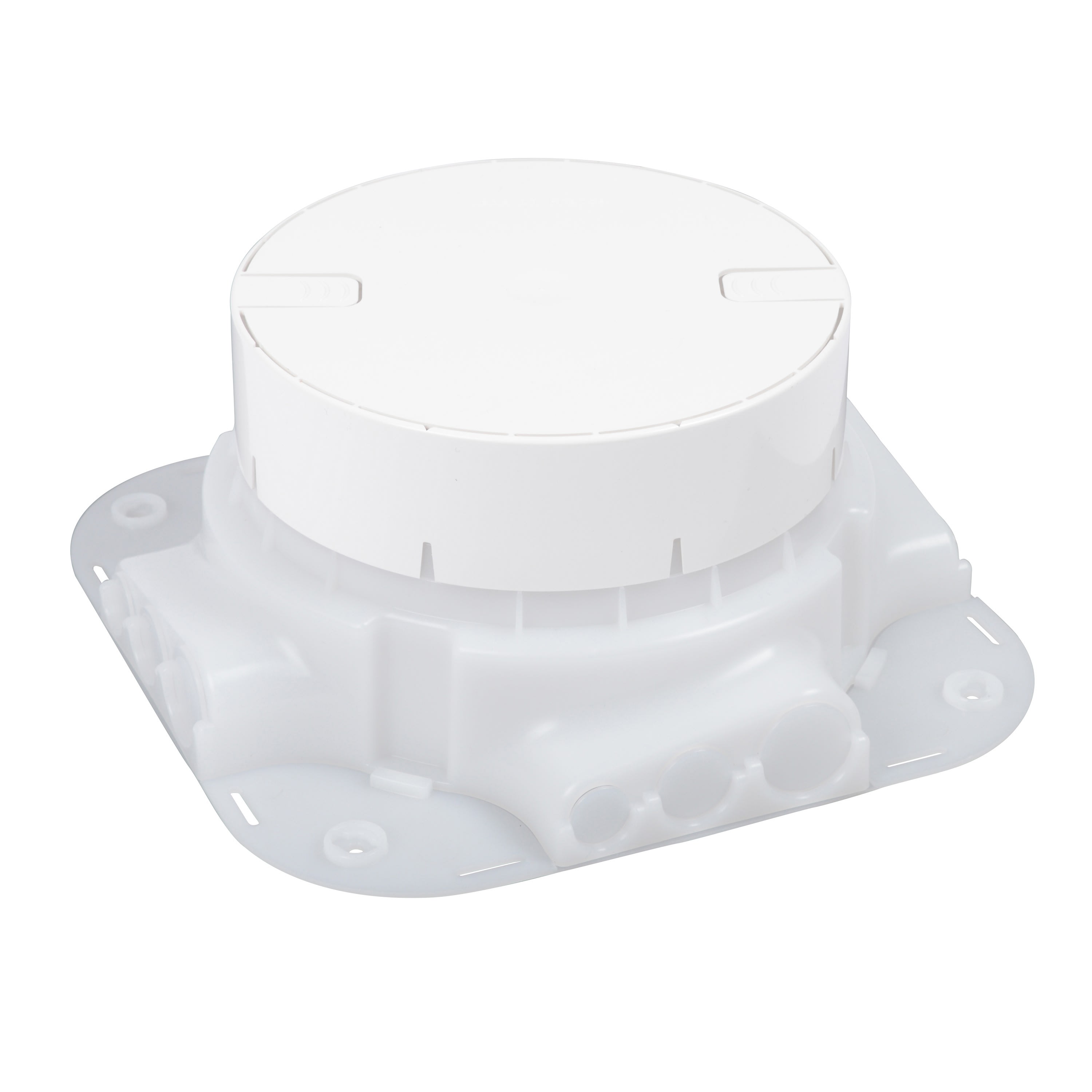 Boîte d'encastrement auto-ajustable pour l'installation de boîtes de sol IP66 dans les sols en béton - Livrée avec couvercle Hauteur de la chape béton : de 65mm à 97mm Sorties de câbles pré-découpées sur les 4 faces pour conduits de diamètres 16mm, 20mm et 25mm Matière plastique Conforme aux normes NF EN 60-670-1 et NF EN 60 670-23