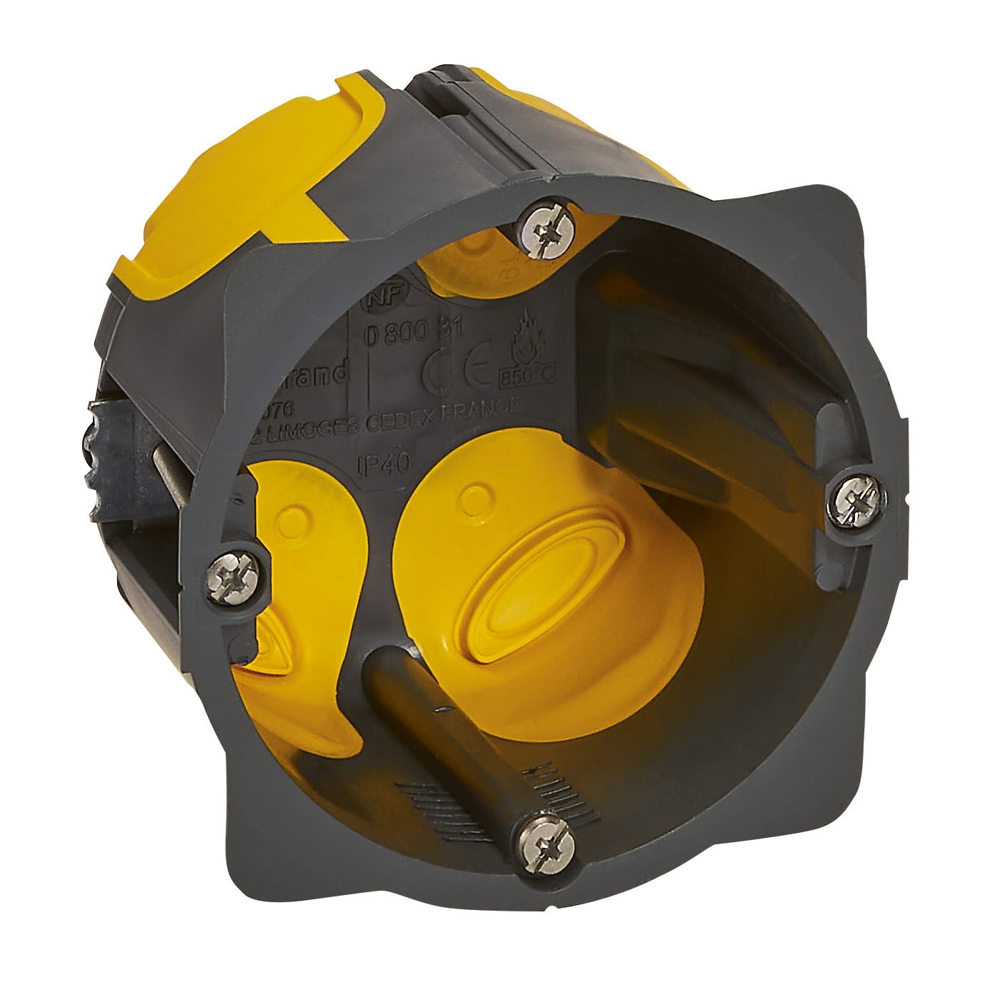 Boîte d'encastrement Eco Batibox monoposte profondeur 50mm - Diamètre de perçage 67mm - Pour montage d'appareillage à vis ou à griffes La boîte Eco Batibox contient au moins 1/3 de matières recyclées, elle contribue à la diminution de l'impact carbone de vos chantiers d'électricité La membrane peut être ouverte sans outil, par un simple geste, et l'entrée de la gaine se fait à 45°. Etanchéité à l’air parfaite grâce à la flexibilité des membranes. Rapidité et simplicité d’installation grâce au guide de l’étrier et à la vis à empreinte mixte. Aussi, excellente tenue sur les cloisons creuses grâce à la surface d’appui des étriers et des collerettes Les boîtes multipostes s'adaptent à toutes les situations et sont réversibles, elles s'installent à l'horizontale comme à la verticale. Elles sont disponibles en 2 postes, 3 postes et 4 postes.