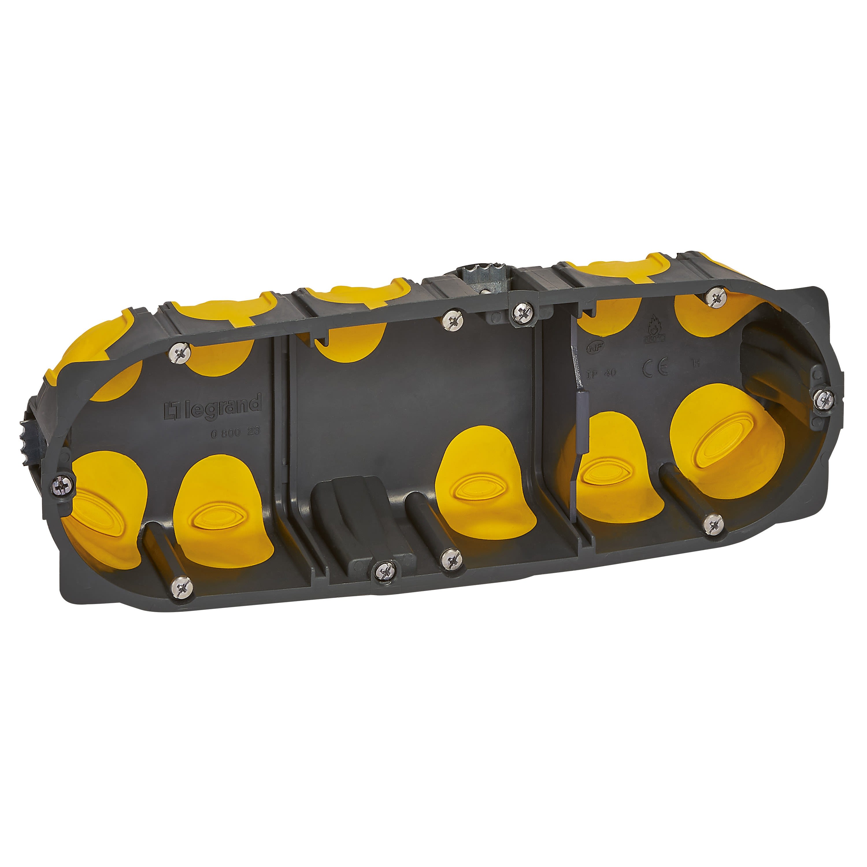 Boîte d'encastrement Eco Batibox 3 postes profondeur 40mm - Pour montage d'appareillage à vis La boîte Eco Batibox contient au moins 1/3 de matières recyclées, elle contribue à la diminution de l'impact carbone de vos chantiers d'électricité La membrane peut être ouverte sans outil, par un simple geste, et l'entrée de la gaine se fait à 45°. Etanchéité à l’air parfaite grâce à la flexibilité des membranes. Rapidité et simplicité d’installation grâce au guide de l’étrier et à la vis à empreinte mixte. Aussi, excellente tenue sur les cloisons creuses grâce à la surface d’appui des étriers et des collerettes Les boîtes multipostes s'adaptent à toutes les situations et sont réversibles, elles s'installent à l'horizontale comme à la verticale. Elles sont disponibles en 2 postes, 3 postes et 4 postes.