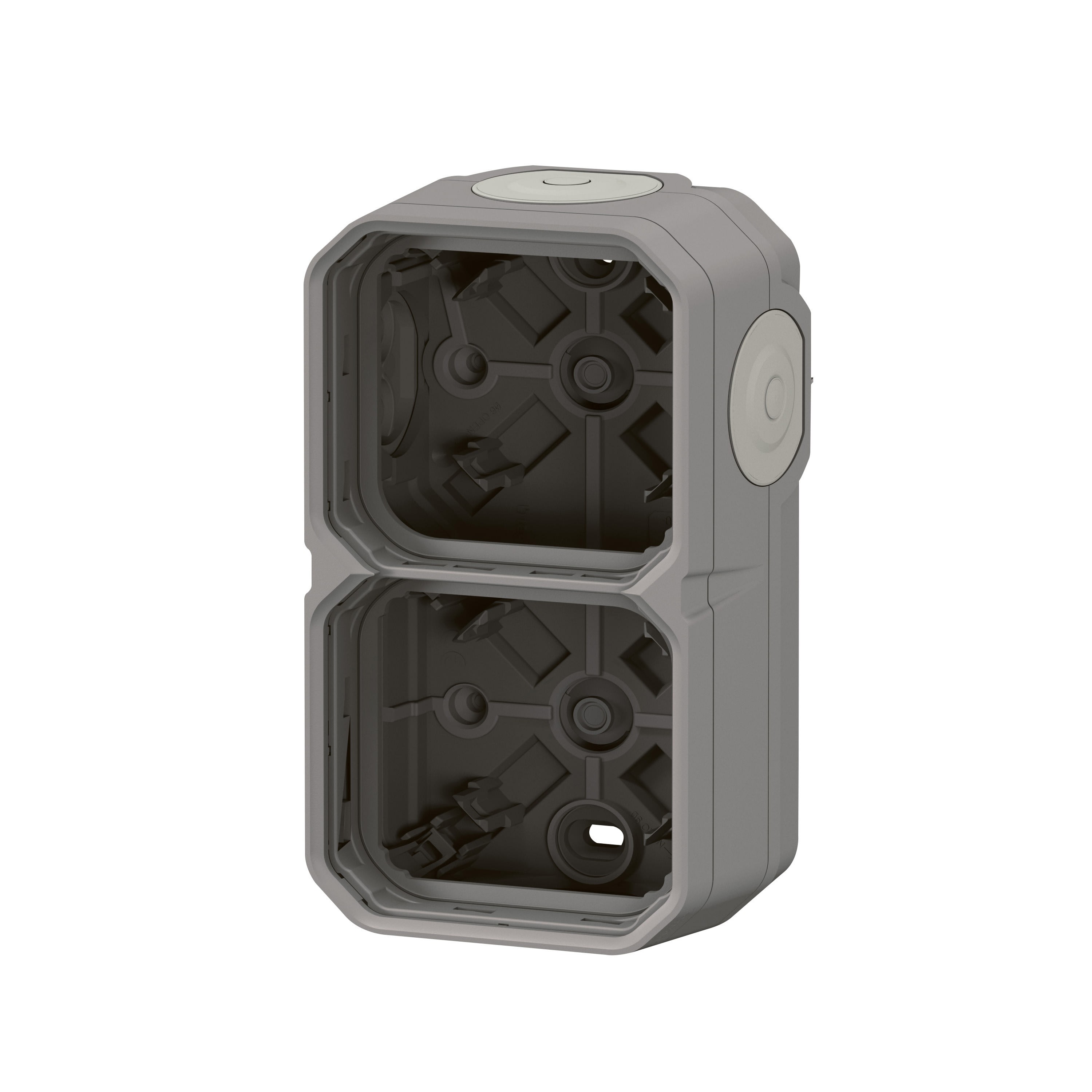 Boitier saillie sur lequel sont installés les produits livrés en mode composable. IP55 : protégé contre les poussières et les projections d'eau à la lance de toutes directions. Matières plastiques avec protection renforcée contre les UV