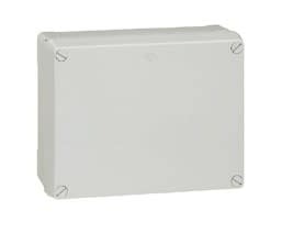 Boîtier industriel plastique - Forte profondeur - IP55 IK08 - Avec couvercle opaque - Gris RAL7035 Dimensions :- hauteur 310mm- largeur 240mm- profondeur 160mm Sans charnière - 4 verrous Faces lisses - Liberté de fixation :- intérieure : 4 trous oblongs en fond de boîte- hors volume de câblage aux 4 angles par vis Ø4mm (livrées)- par pattes de fixation murale Ouverture/fermeture 1/4 de tour du couvercle par tournevis plat