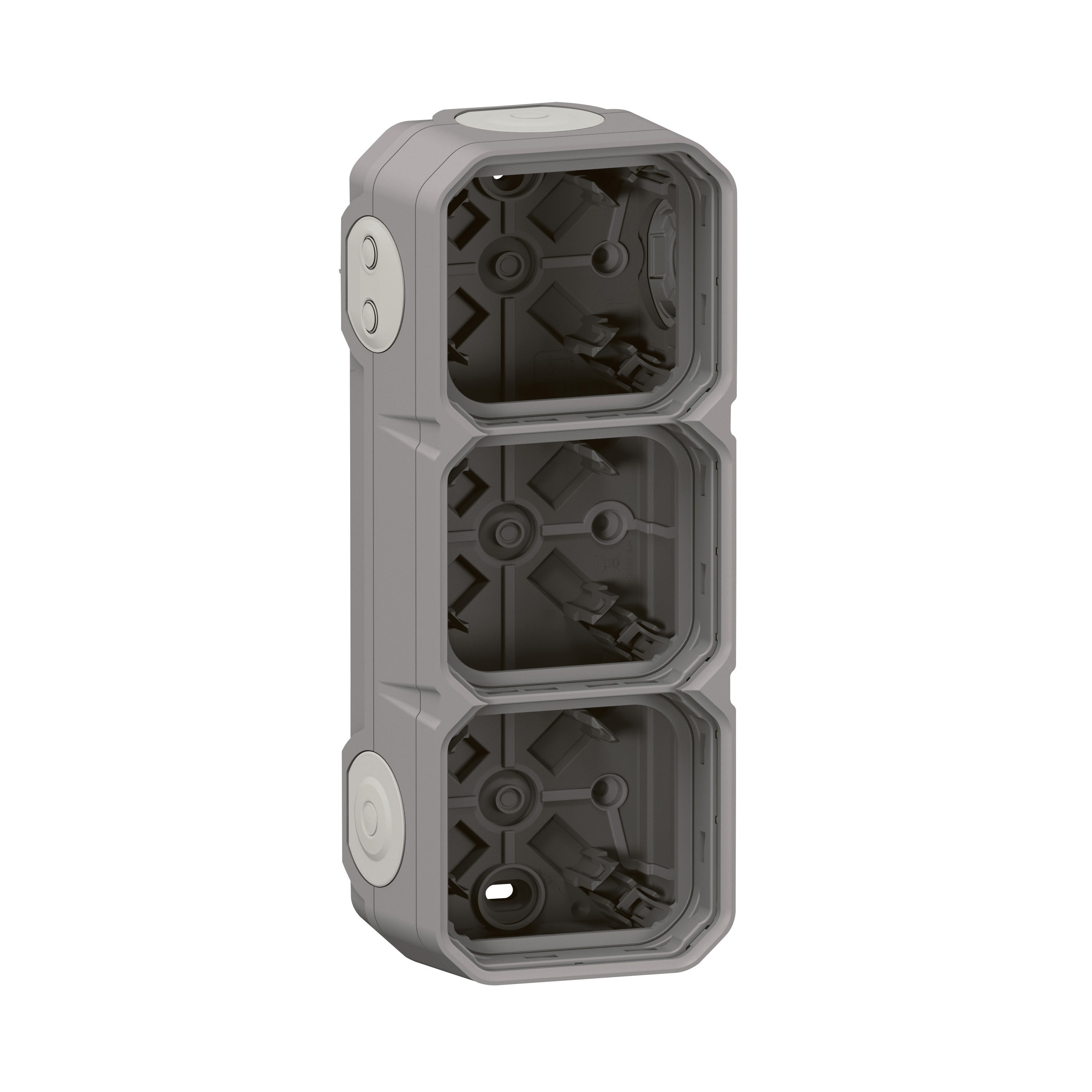 Boîtier saillie étanche Plexo 3 postes pour montage horizontal ou vertical, sans cloison, avec 4 embouts à membrane amovible et perforable sans découpe 1 entrée et 1 embout 2 entrées - gris