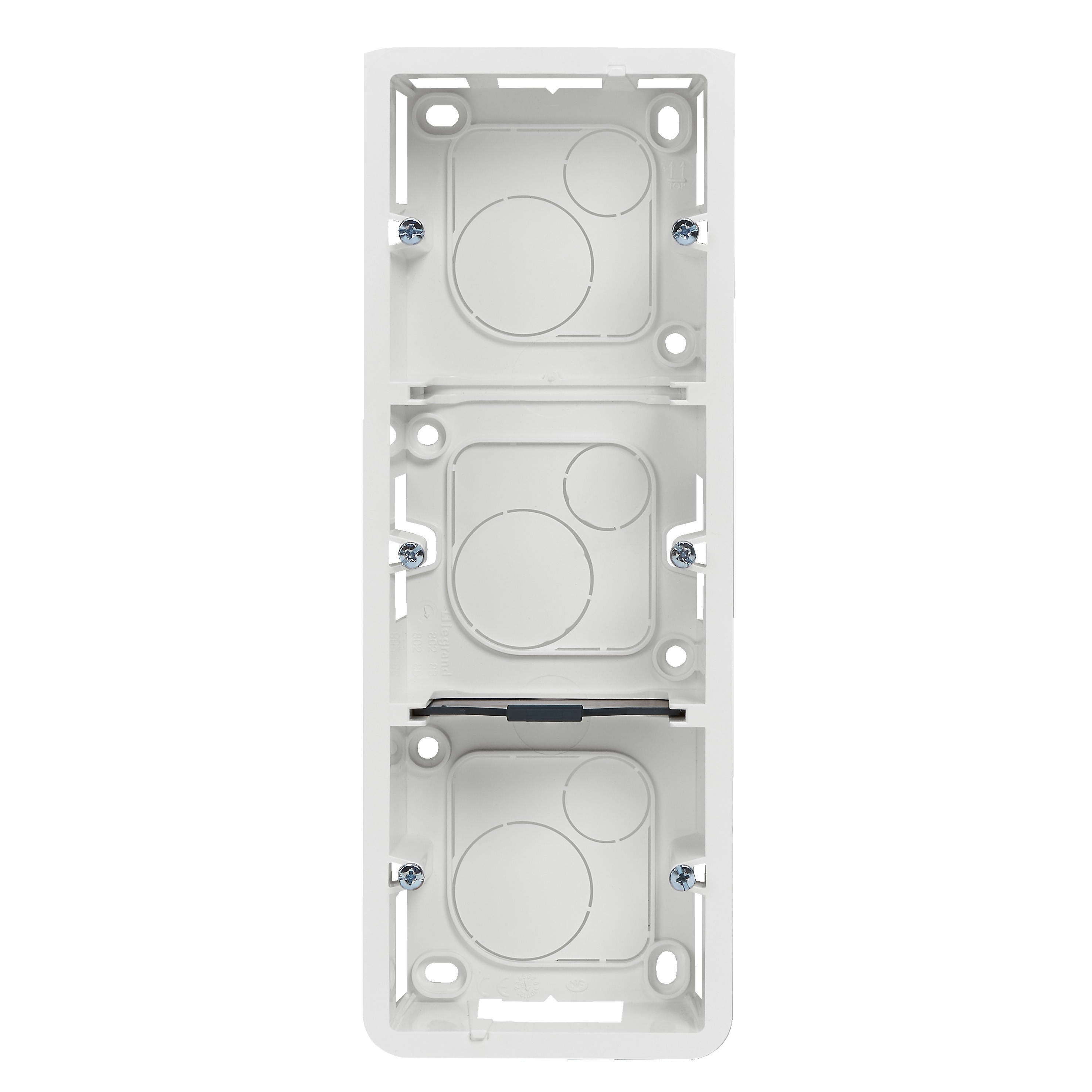 Cadre saillie Mosaic 3x2 modules en montage vertical - A utiliser avec le support Batibox référence 080253 Profondeur 40mm Equipé d'une entrée amovible pour moulure 20x12,5mm - Installation en saillie avec conduits apparents (moulure/goulotte) ou avec conduits encastrés Livré avec vis Blanc RAL9003 finition brillante