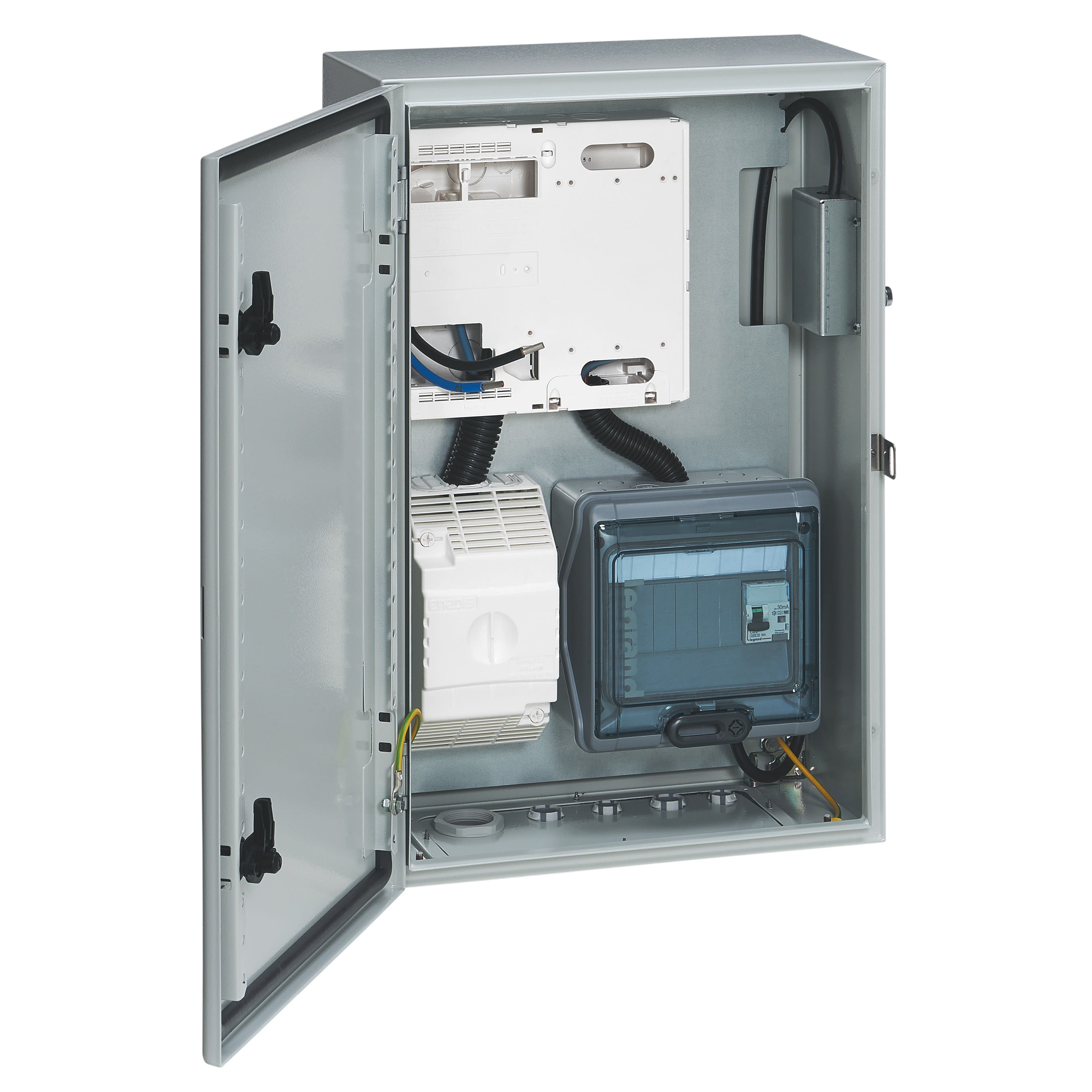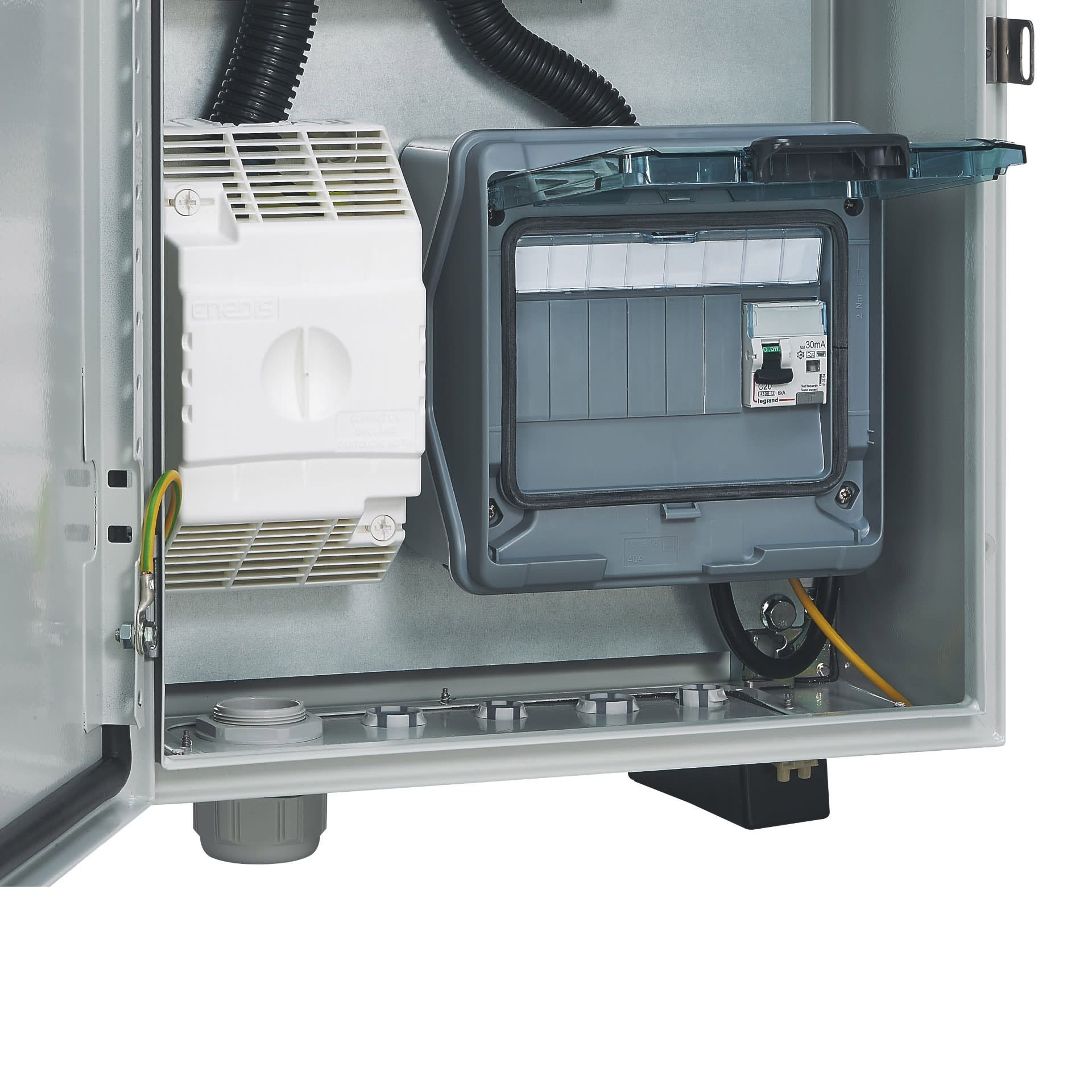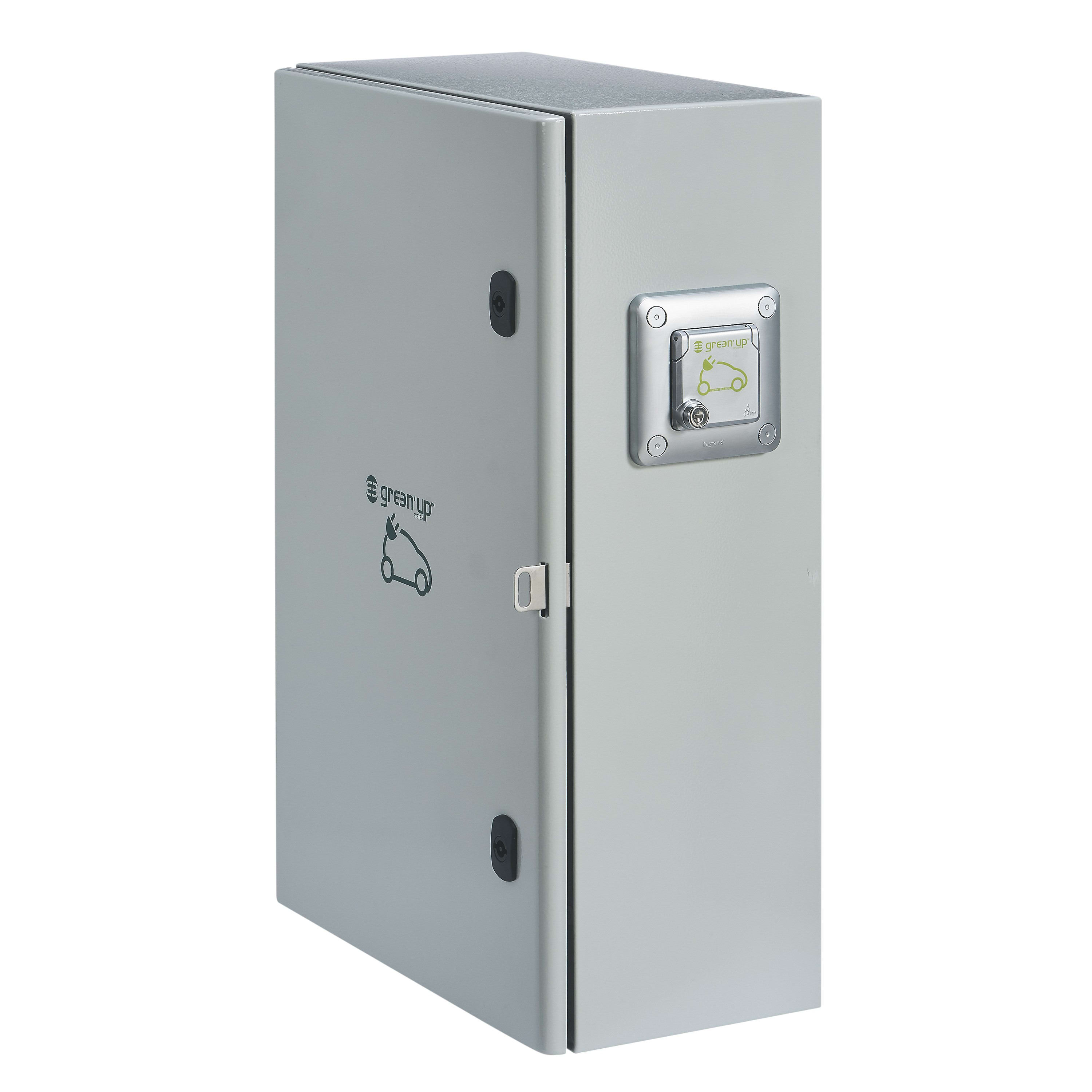 Coffret pré-équipé selon la norme NF C 14-100 avec CCPI et platine pour compteur Linky Pour la création de dérivations individuelles sur réseau électrique auto (colonne horizontale ENEDIS) Point de charge Green'Up Access précablé avec disjoncteur différentiel 20A courbe C - 30mA type F - Mode 2 Coffret IP 55 / IK 10