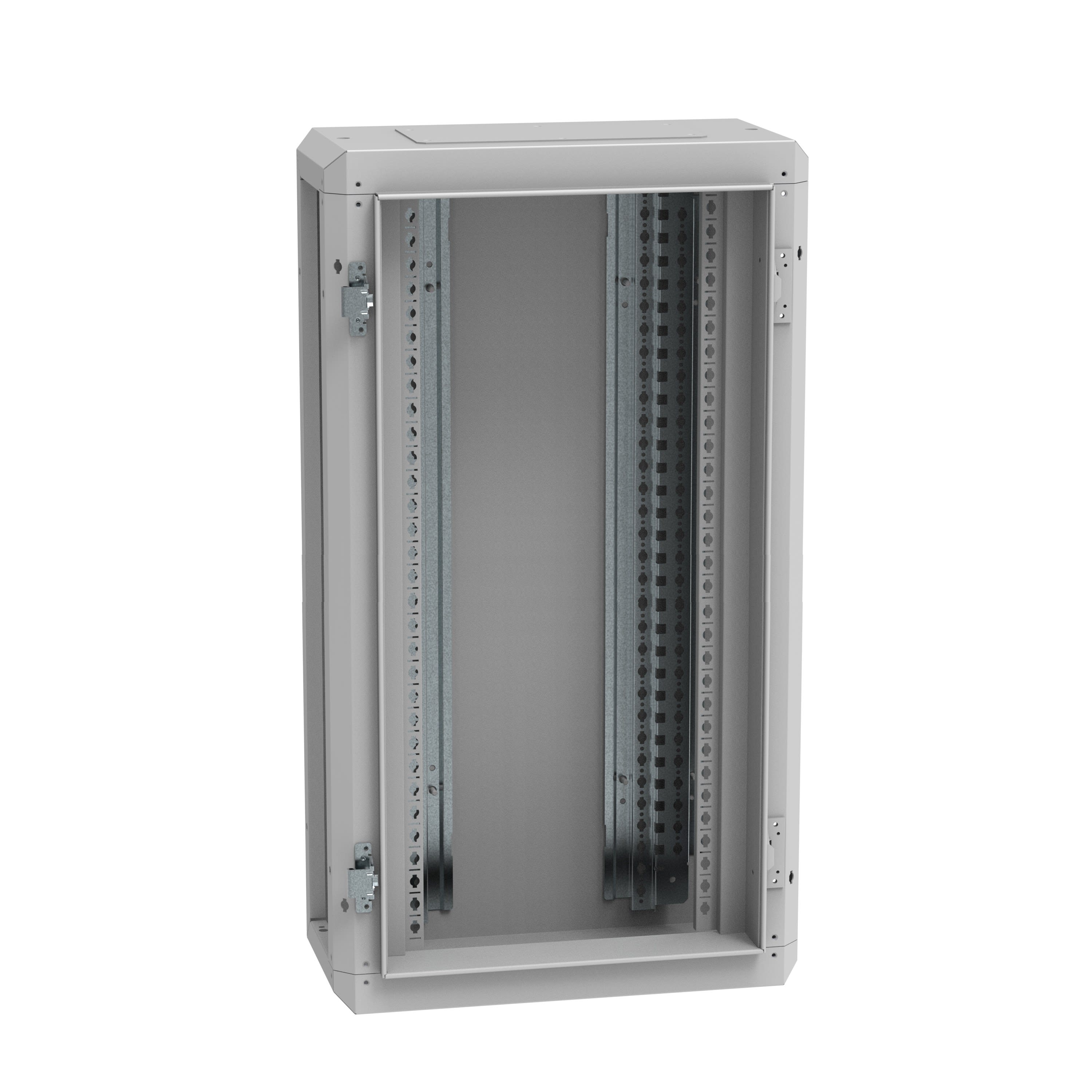 Dimensions extérieures : hauteur 996mm - largeur 506mm - profondeur 252mm IP55 - IK08 avec porte Structure soudée et montants fonctionnels vissés à l'arrière du coffret pour une plus grande rigidité Panneaux à commander séparément Revêtement époxy polyester RAL7035