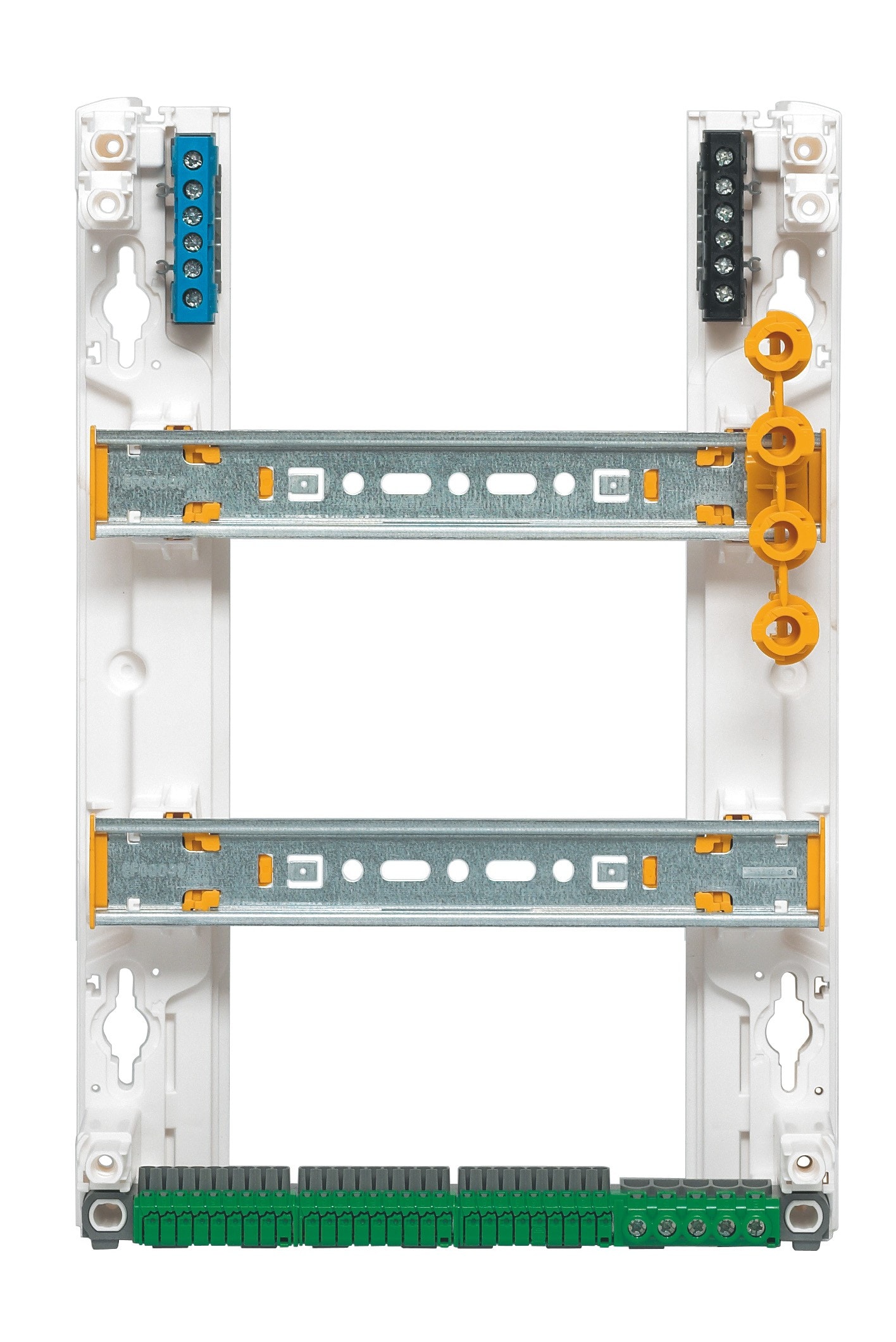 Coffret Drivia 2 rangées de 18 modules - 375x355x103,5mm Livré avec :- bornier à connexion automatique IP2X pour conducteurs de protection - 1 bornier Phase et 1 bornier Neutre IP2X- obturateurs séparables par module et demi-module- accessoires de pré-fixation sur goulotte GTL (ou sur mur) Drivia clip- accessoires de jumelage horizontal/vertical (pour 2 coffrets ou coffret + platines) Drivia easy- porte plans adhésif - planche d'étiquettes et bandeau de repérage des appareils modulaires- 1 porte-étiquette par rangée IP30 - IK05 (IP40 - IK07 avec porte) - Classe II avec plaques de fond isolantes - Blanc RAL9003 Espace sous rails : 40mm - Entraxe entre rails : 125mm Auto-extinguibilité : tenue au fil incandescent 750°C conforme à la réglementation des ERP (Etablissements Recevant du Public) et des IGH (Immeubles de Grande Hauteur) selon la norme NF EN 60 695-2-11 - Conforme à la norme IEC 60670-24 - Conforme à la norme IEC 62 208 : permet de réaliser des ensembles conformes à l'IEC 61 439-3