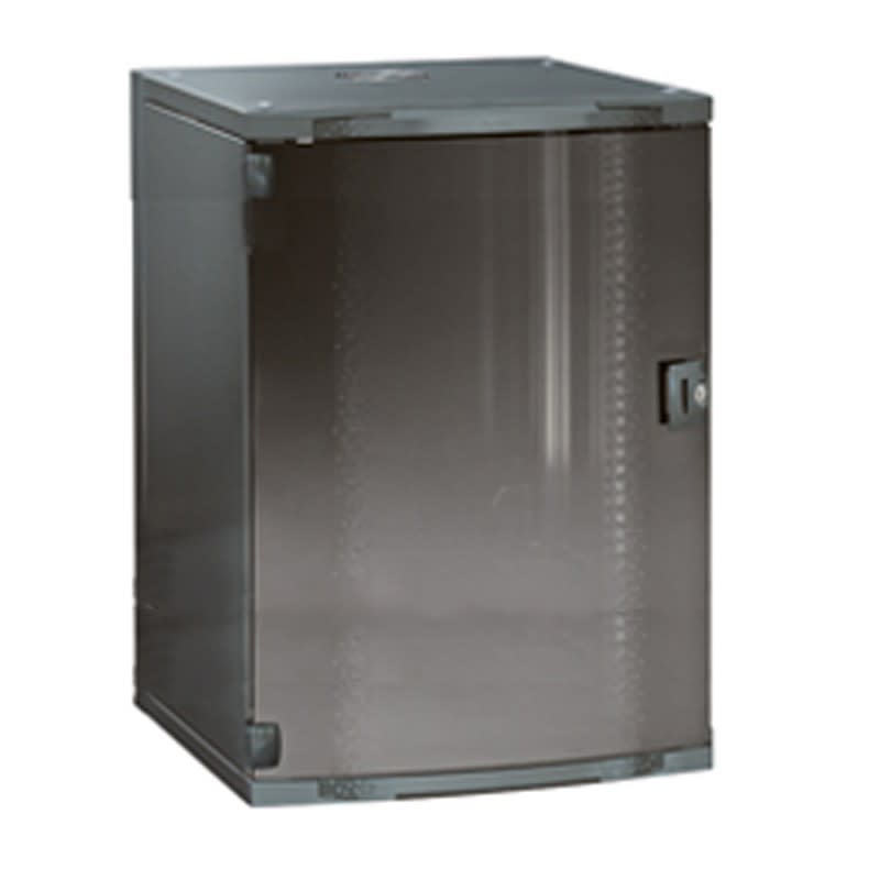 Coffret 19pouces LCS³ pivotant - IP20 - IK08 - capacité 21U Composé :- d'une base (fixation murale)- d'un corps pivotant permettant le libre accès à l'arrière du coffret pour faciliter l'installation et la maintenance - Sens de pivotement réversible - Plaque d'entrée de câbles pleine en partie haute et basse, possibilité de montage d'une plaque avec balai référence 046255 Dimensions :- Largeur : 600mm- Hauteur : 1000mm- Profondeur : 600mm- Charge admissible 63kg Comporte :- une porte galbée réversible en verre de sécurité sérigraphié- une fermeture par serrure à clé 2433A- des panneaux latéraux pivotants, démontables par l'intérieur sans outil- 2 montants 19pouces avec aide au réglage en profondeur- des ouïes hautes et basses pour ventilation naturelle, pouvant recevoir un ventilateur en partie haute Gris anthracite RAL7016