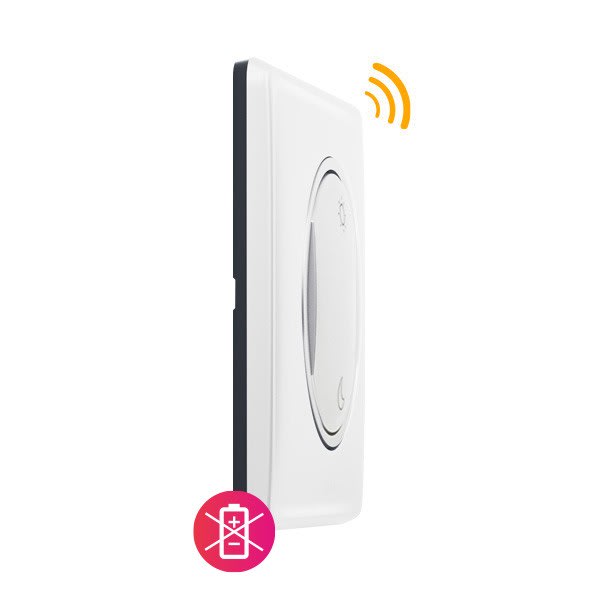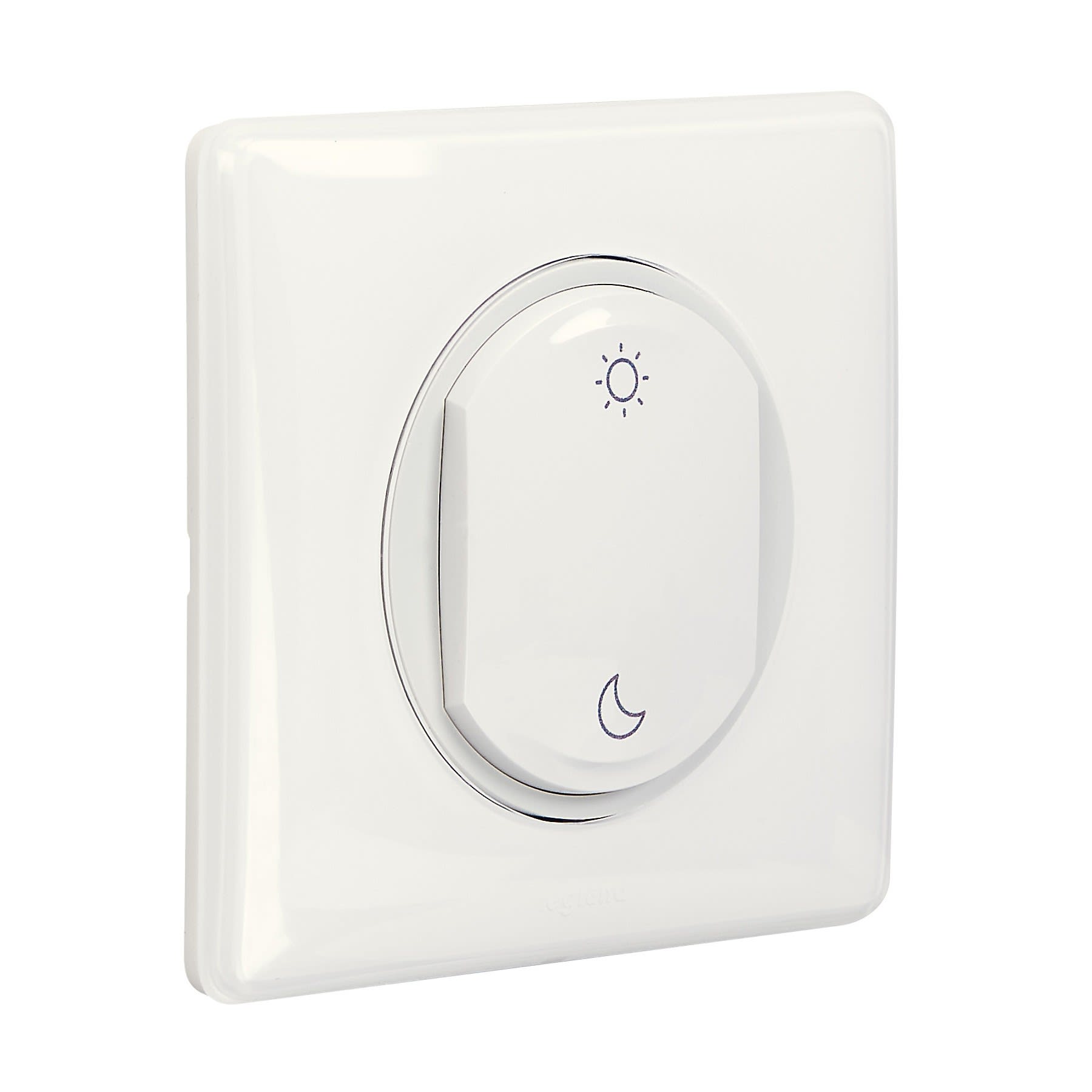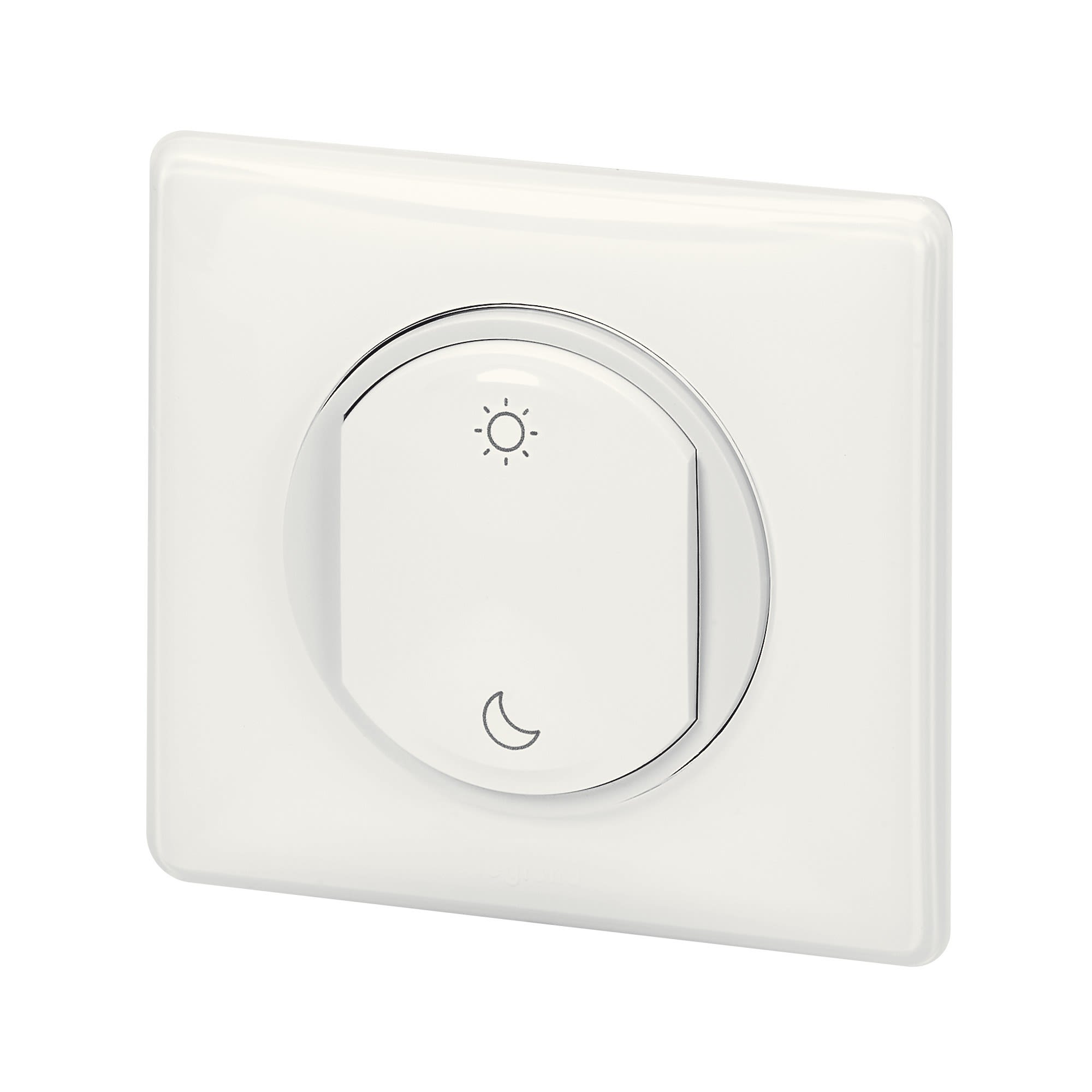 Scénarios Lever/Coucher prédéfinis et personnalisables depuis l'App Home + Control . Livrée avec adhésifs repositionnables pour la fixation de la commande sur tous supports Livrée avec enjoliveur et support À équiper d'une plaque Blanc