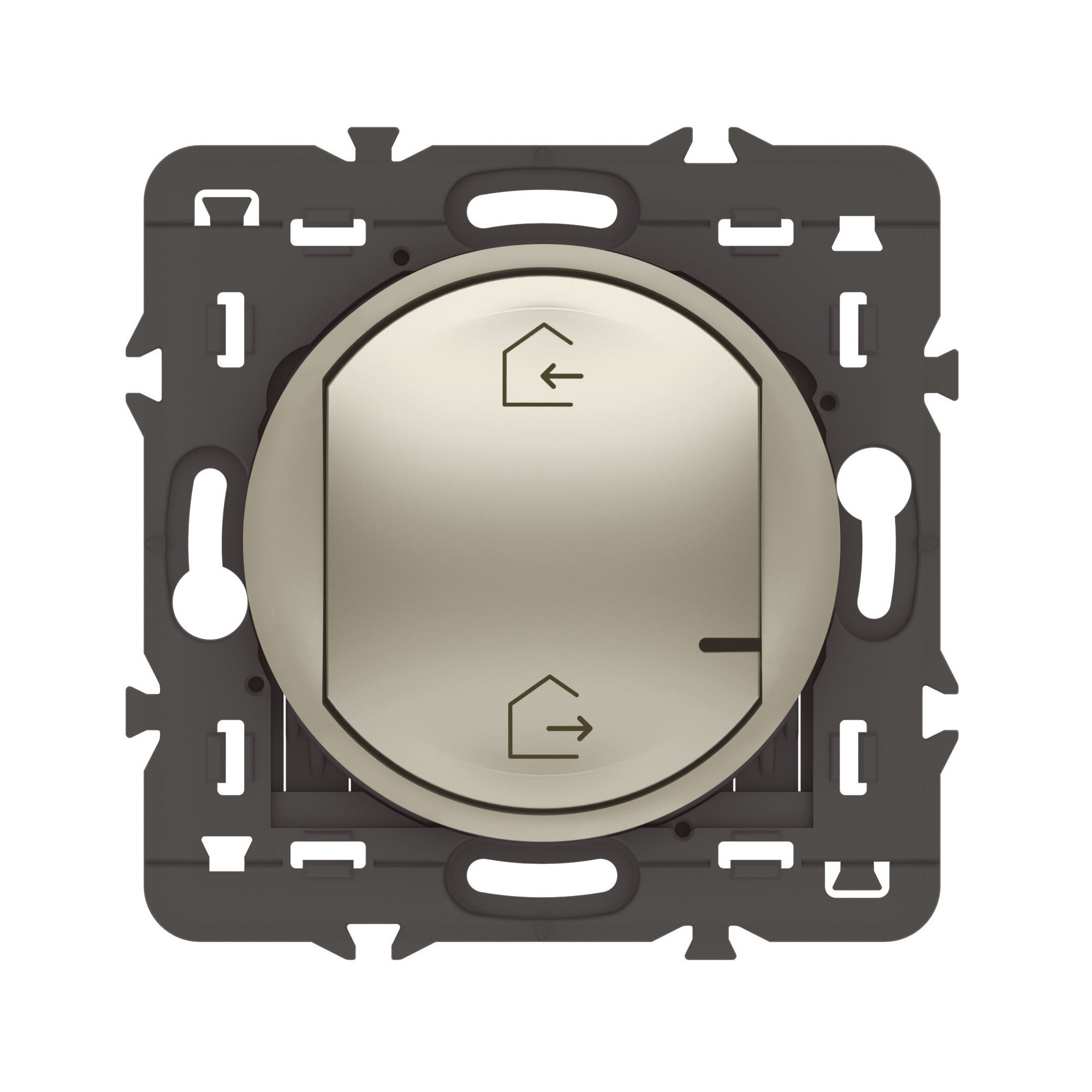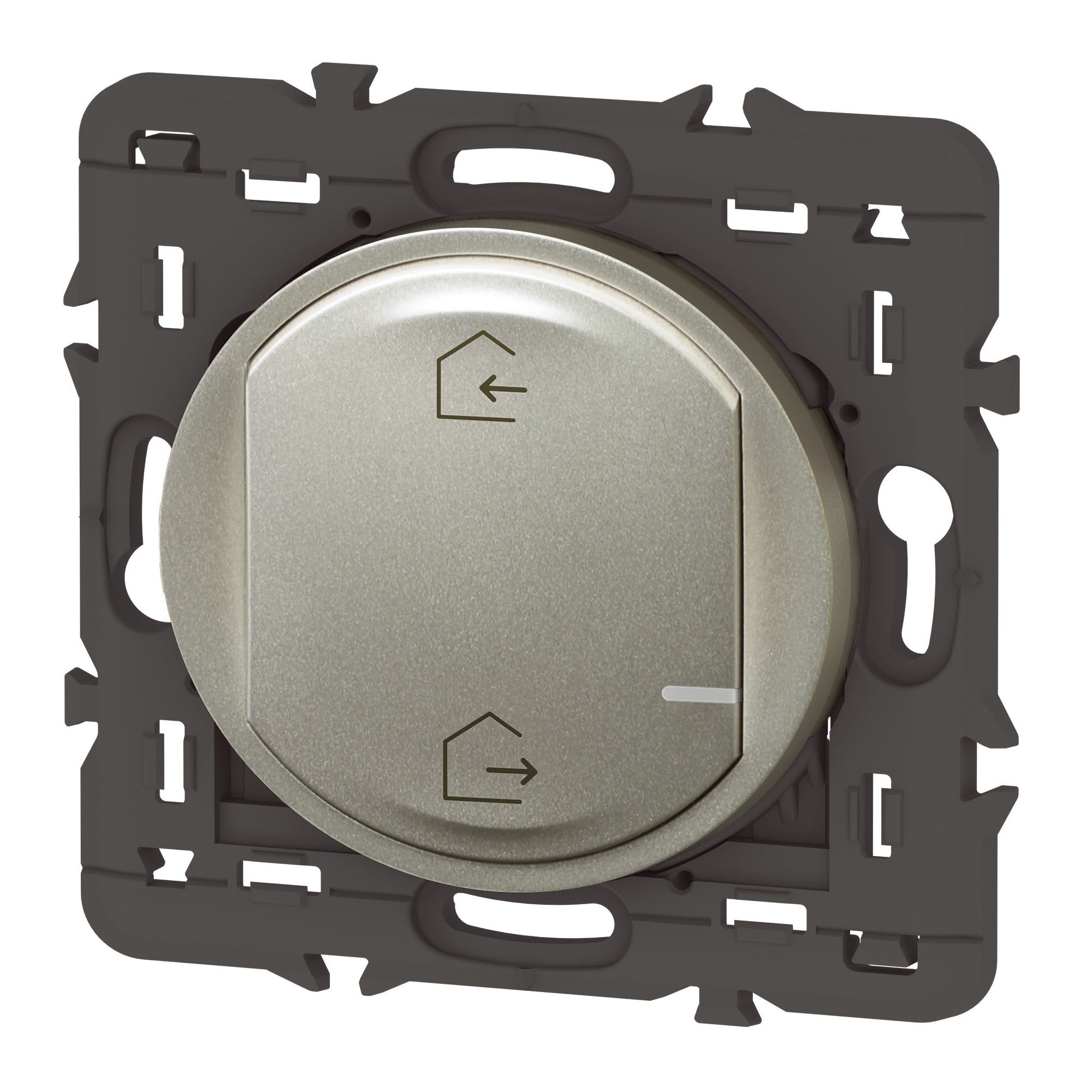 Scénarios Départ/Arrivée prédéfinis et personnalisables depuis l'App. Home + Control - Vous choisissez dans l'App. Home + Control les éclairages, volets roulants ou appareils électriques que vous souhaitez contrôler via les scénarios Départ et Arrivée, et vous les gérez en un seul appui sur votre commande générale sans fils Voyant LED avec indicateur de batterie faible Livrée avec une pile remplaçable d’une durée de vie de 8 ans La commande générale départ/arrivée sans fils est fournie avec une pile d'une durée de vie de 8 ans - Cette pile est changeable - Une alerte de fin de vie de pile est disponible dans l'application Titane