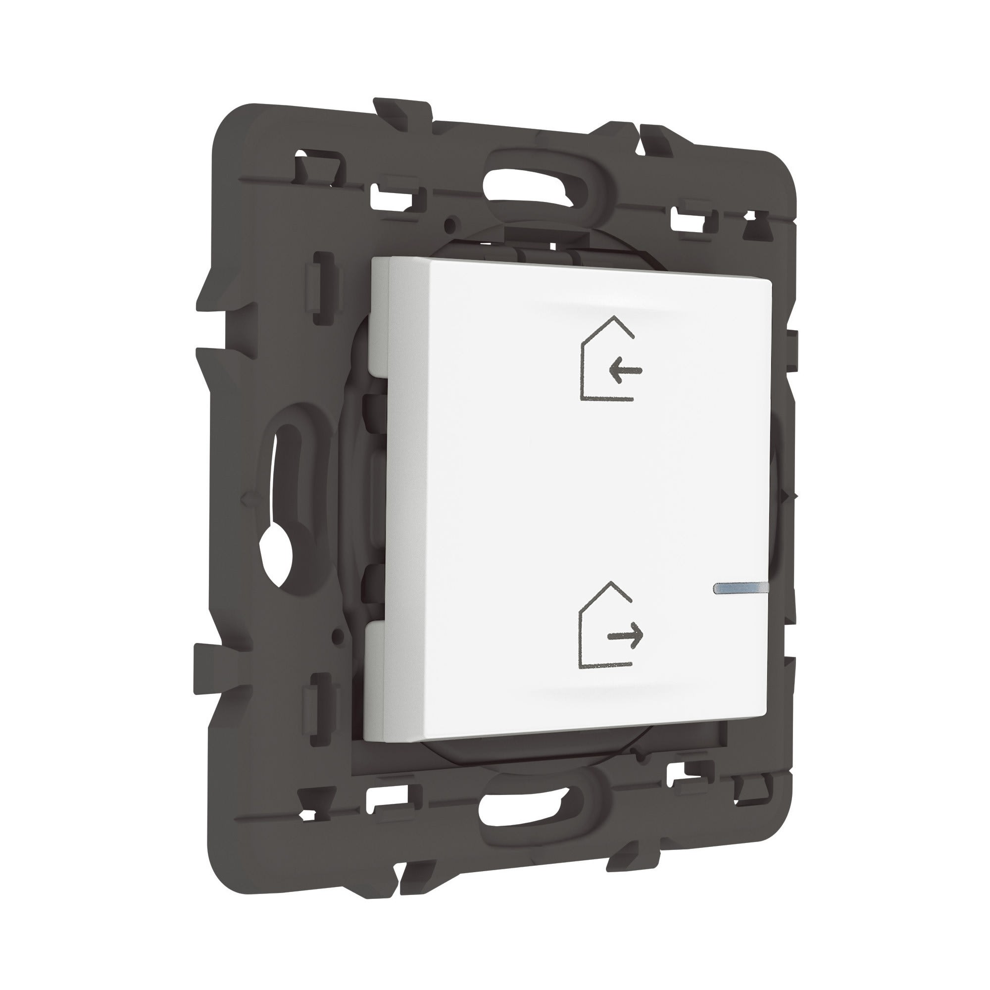 Scénarios Départ/Arrivée prédéfinis et personnalisables depuis l'App. Home + Control - Vous choisissez dans l'App. Home + Control les éclairages, volets roulants ou appareils électriques que vous souhaitez contrôler via les scénarios Départ et Arrivée, et vous les gérez en un seul appui sur votre commande générale sans fils Voyant LED avec indicateur de batterie faible Livrée avec une pile remplaçable d'une durée de vie de 8 ans Blanc