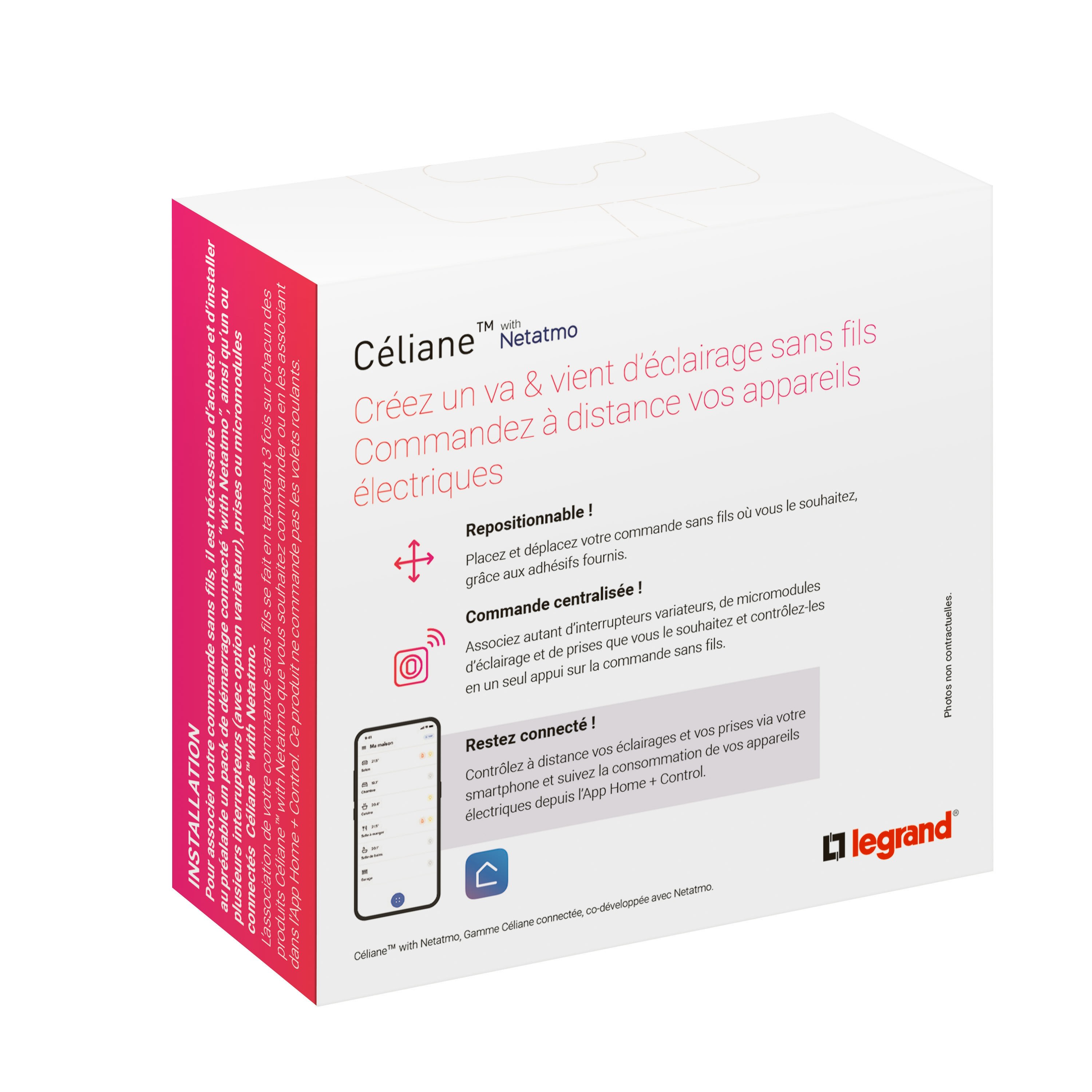 Céliane™ with Netatmo permet d'installer des fonctions connectées dans votre habitat en accord avec votre appareillage Céliane. La version connectée de Céliane permet de contrôler l'éclairage, les volets roulants et les appareils électriques, manuellement par une commande sans fils, un interrupteur ou via la voix avec les assistants vocaux Home d'Apple, Alexa d'Amazon et Google Home et également à distance par un smartphone avec l'App. Home + Control. La commande générale permet de centraliser les commandes, d'éteindre toutes les lumières, baisser tous les stores... La mise en oeuvre est simple avec un câblage classique et intuitif avec l'appairage des fonctions.