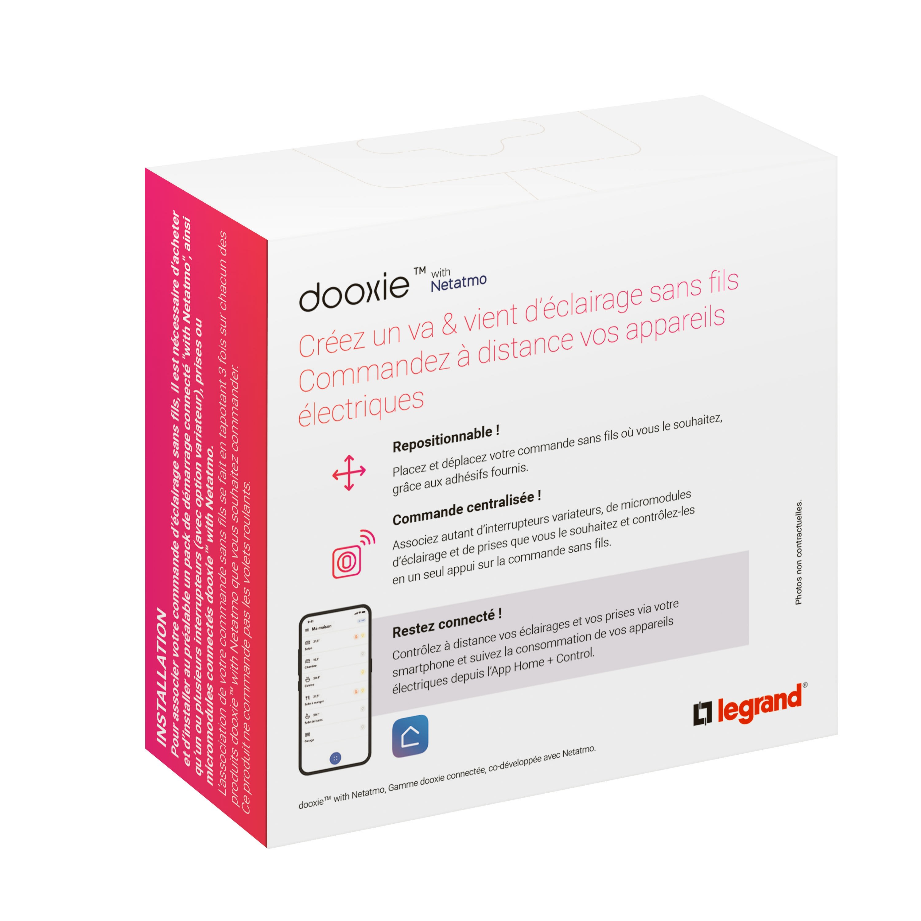 dooxie™ with Netatmo : le design dooxie™ en plus de la sécurité, la praticité et la facilité de mise en œuvre qu'apporte Netatmo. La version connectée de dooxie permet de contrôler l'éclairage, les volets roulants et les appareils électriques, manuellement par une commande sans fils, un interrupteur ou via la voix avec les assistants vocaux Home d'Apple, Alexa d'Amazon et Google Home et également à distance par un smartphone avec l'App. Home + Control. La commande générale permet de centraliser les commandes, d'éteindre toutes les lumières, baisser tous les stores... La mise en oeuvre est simple avec un câblage classique et intuitif avec l'appairage des fonctions.