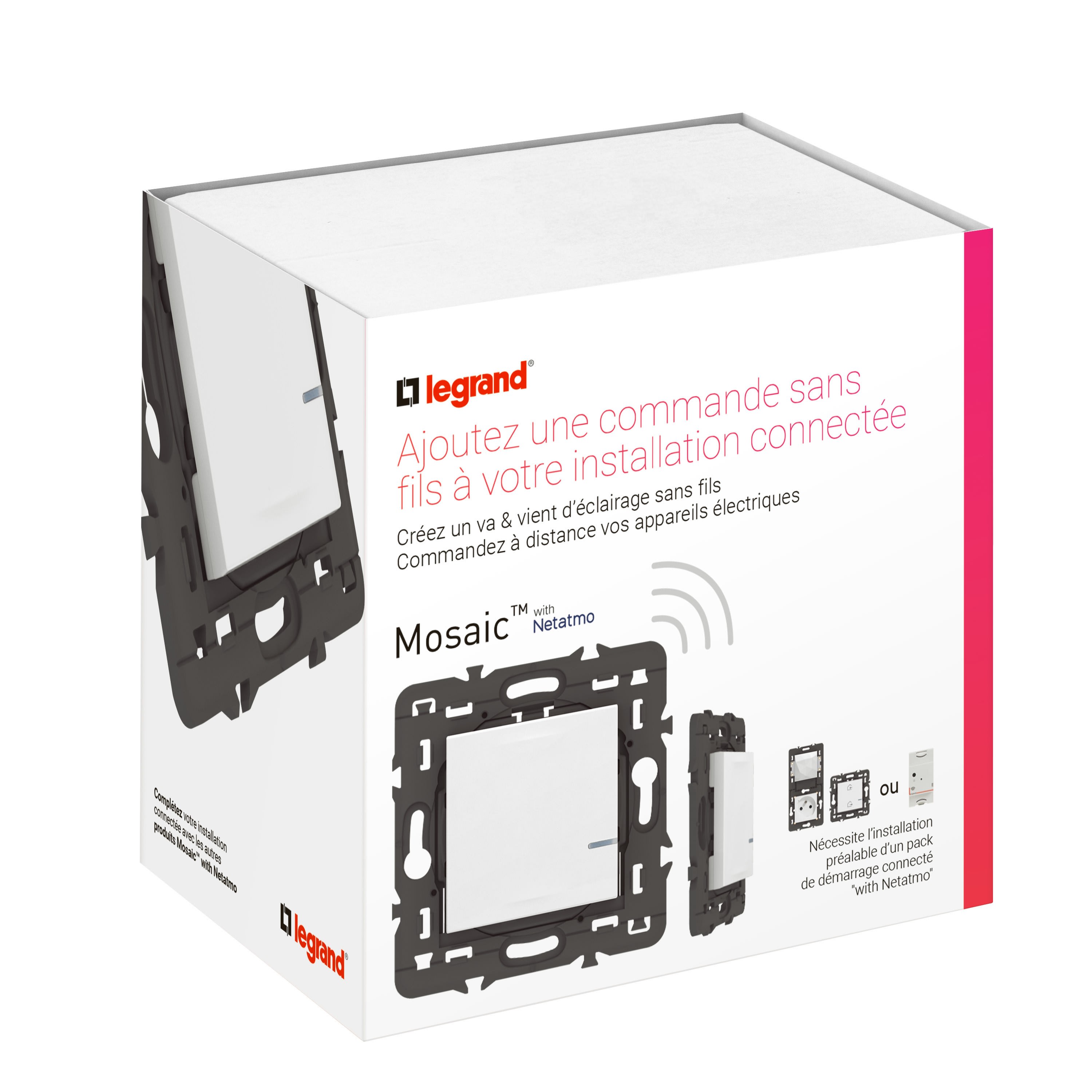 Mosaic™ with Netatmo : l'esthétique et la fiabilité de Mosaic au service de la maison connectée. La version connectée de Mosaic permet de contrôler l'éclairage, les volets roulants et les appareils électriques, manuellement par une commande sans fils, un interrupteur ou via la voix avec les assistants vocaux Home d'Apple, Alexa d'Amazon et Google Home et également à distance par un smartphone avec l'App. Home + Control. La commande générale permet de centraliser les commandes, d'éteindre toutes les lumières, baisser tous les stores... La mise en oeuvre est simple avec un câblage classique et intuitif avec l'appairage des fonctions.