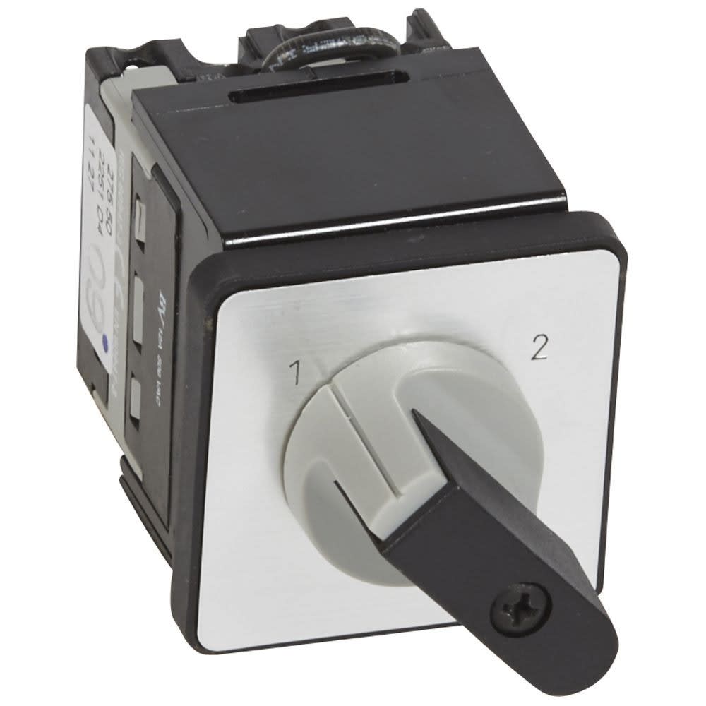 Commutateur à cames inverseur sans arrêt manette gamme PR12 - 1P - 2 contacts - 16A maximum en AC21 - contact à ouverture positive et double coupure des pôles - fixation centrale Ø22 sur porte - IP40