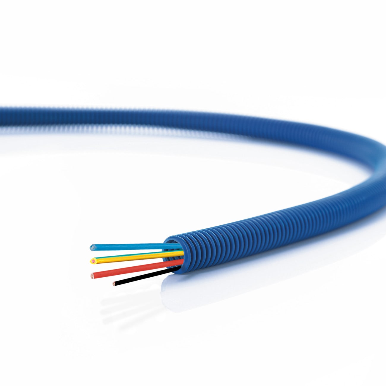Conduit cintrable ICTA 3422 Chronofil pour courant fort Ø20mm avec 3 conducteurs 2,5mm² bleu , rouge et vert et jaune + 1 conducteur 1,5mm² noir - conduit seul IP68 - conduit + manchon IP44 - bleu RAL5010 - conforme à la norme EN 61386-22
