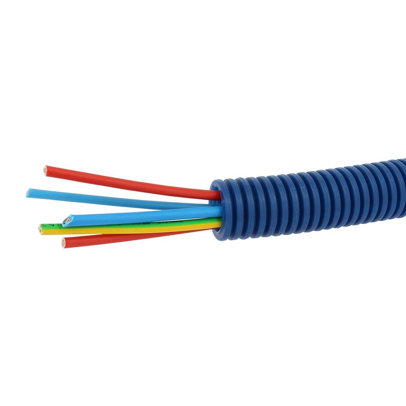 Conduit ICTA3422 Chronofil® - diamètre 20mm - bleu RAL5010 - pour courants forts 3 conducteurs x 2,5mm² - Bleu, Rouge et Vert - Jaune + 2 conducteurs x 1,5mm² - Bleu et Rouge Système d'identification des circuits : bleu pour les courants forts, vert pour les courants faibles Conduit seul : IP68 - Conduit + manchon : IP44 - Conduits préfilés mono et multiconducteurs - ICTA : Isolant, Cintrable, Transversalement élastique, Annelé Conforme à la norme EN 61 386-22 - La marque NF apposée sur le conduit ne concerne que le conduit