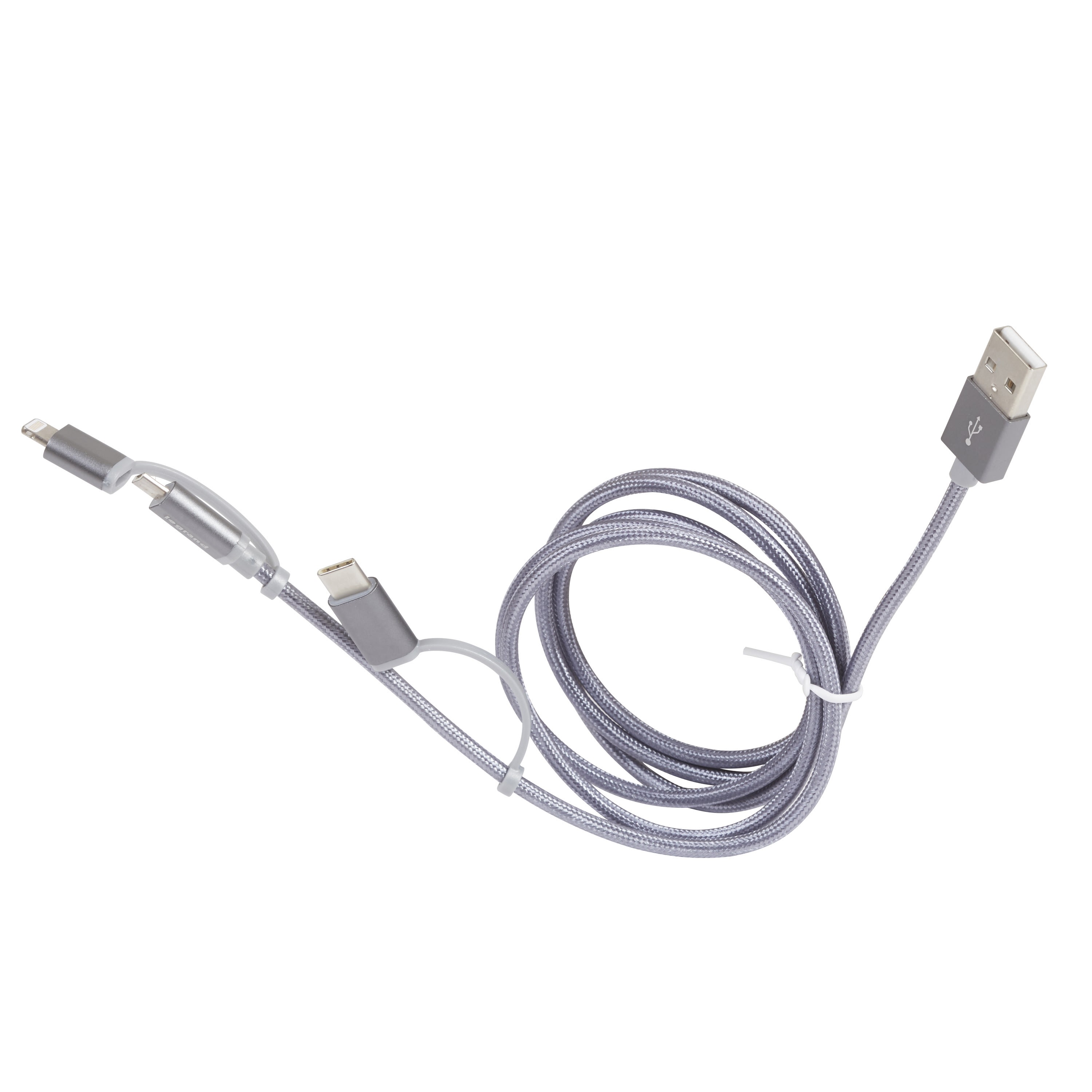 Cordon USB Type-A vers micro USB/USB C/Lightning 5V - 2.4A - 12W - câble 1,2m 2 fonctions :- recharge : 2400mA- transmission de données 480Mbps Cordon en tissu tressé gris et connecteurs en aluminium Gris