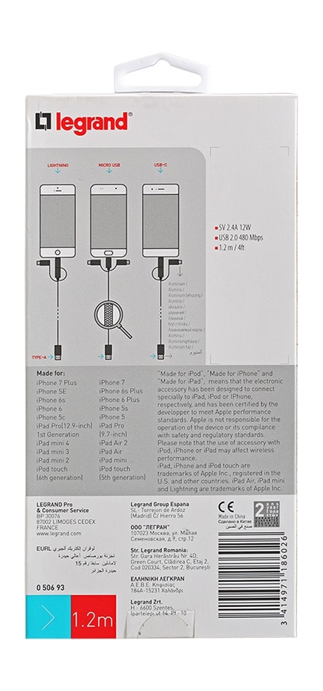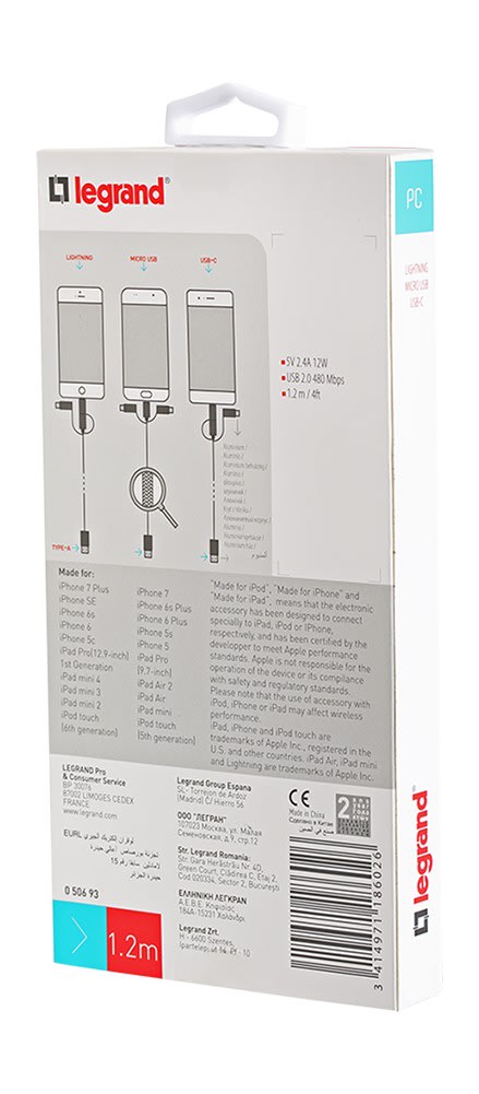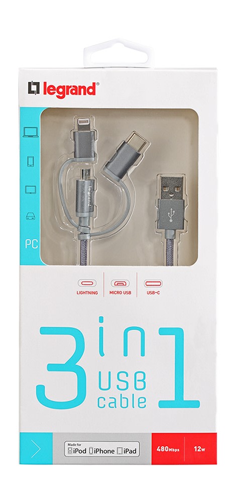 Legrand - Cordon USB Type-A vers micro USB , USB C et Lightning - 050693