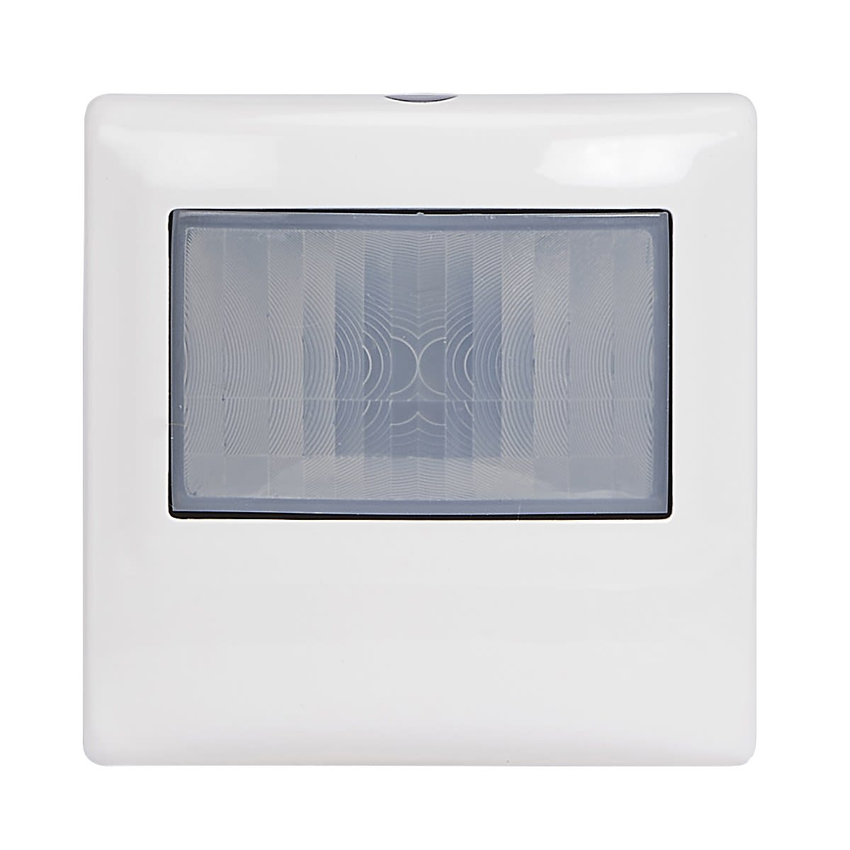Détecteur mural universel Mosaic à détection infrarouge, compatible toutes lampes et jusqu'à 100W LED, câblage 2 fils sans Neutre - 2 modules blanc RAL9003 finition brillante - à équiper de support et plaque Mosaic