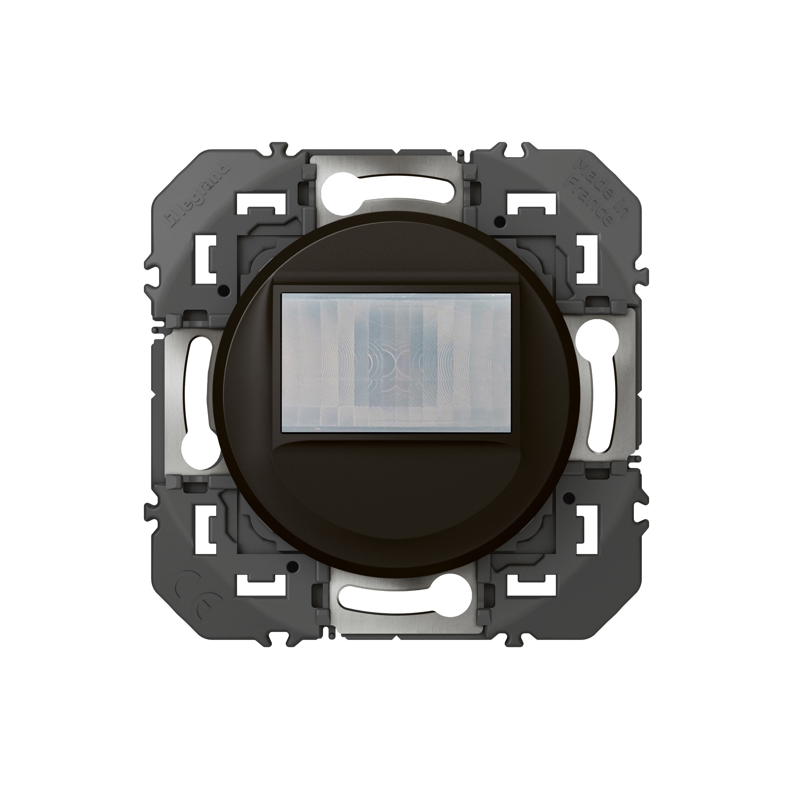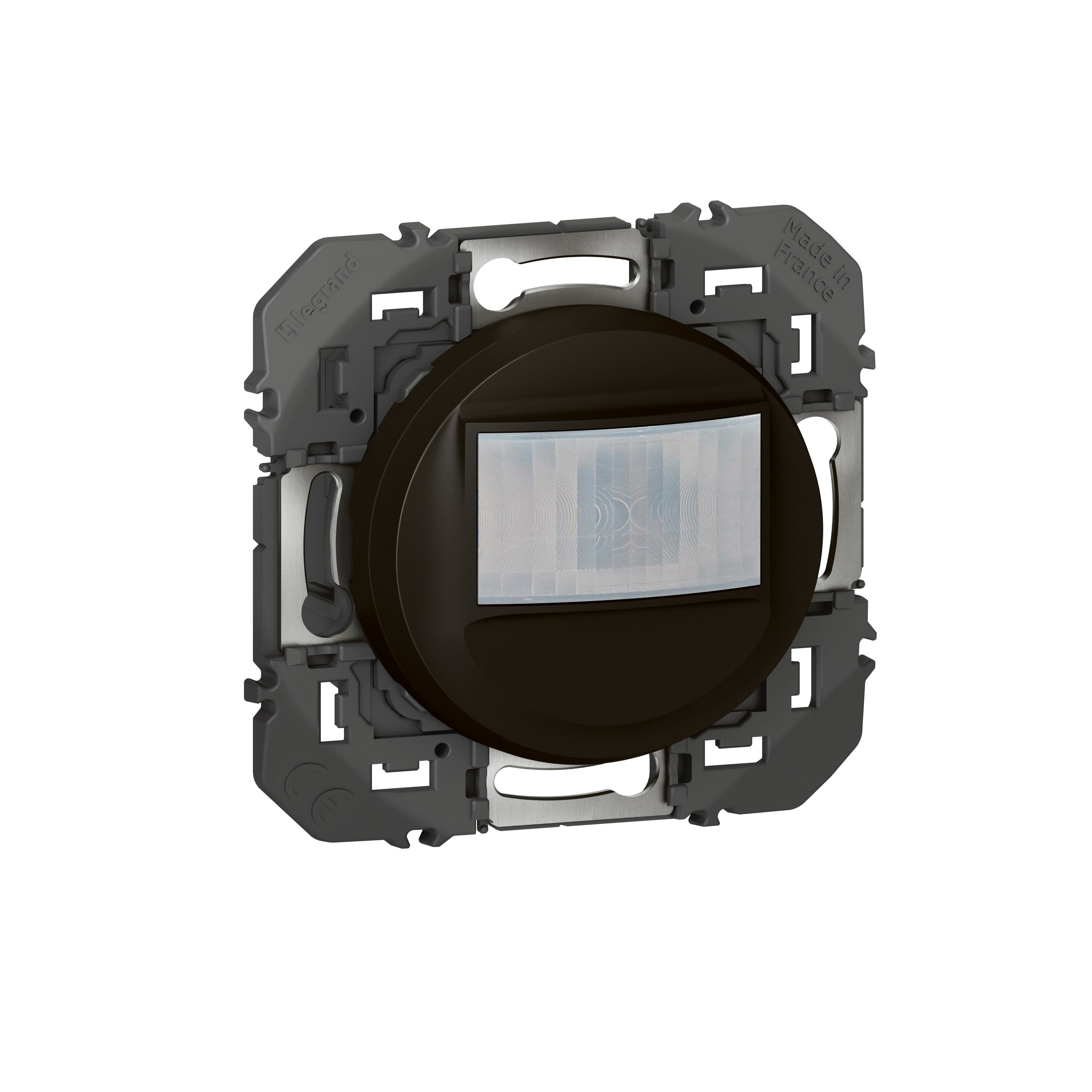 Détecteur de mouvement avec ou sans dérogation, câblage 2 fils sans Neutre dooxie finition noir - À équiper d'une plaque Permet la commande de lampes :- 100W LEDs/fluocompact - 150W Halogène - 150VA LEDs, CFLs, Halogène, tube fluo avec ballast ferromagnétique ou électronique Compatible avec boîte d'encastrement profondeur 40mm Peut s'associer à une minuterie électronique modulaire référence 412602 Livré avec coque de protection chantier à charnières : protège le produit de la poussière et des éclaboussures de peinture et permet au mécanisme de rester utilisable pendant le chantier