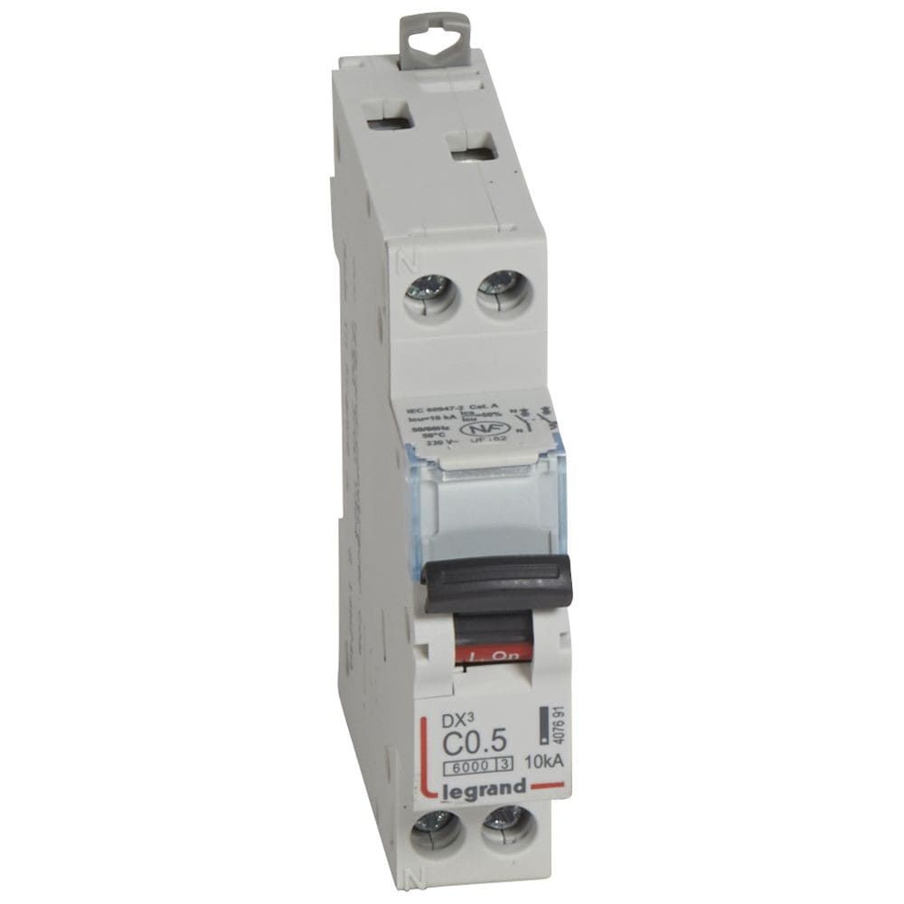 Disjoncteur DX³ unipolaire 230V~ à 400V~ pouvoir de coupure :- 6000A conforme à la norme NF EN 60891-1- 400V~ pour les installations résidentielles- 10kA conforme à la norme EN 60947-2- 400V~ Protection des départs : arrivée haute et sortie basse par bornes à vis Intensité nominale 0,5A - Courbe C (déclenchement magnétique 7In +/- 20%) - 1 module Pour peigne HX³ optimisé universel unipolaire (phase ou neutre) ou tétrapolaire Reçoit les auxiliaires et accessoires DX³ - Bornes protégées contre le toucher IP20, appareil câblé