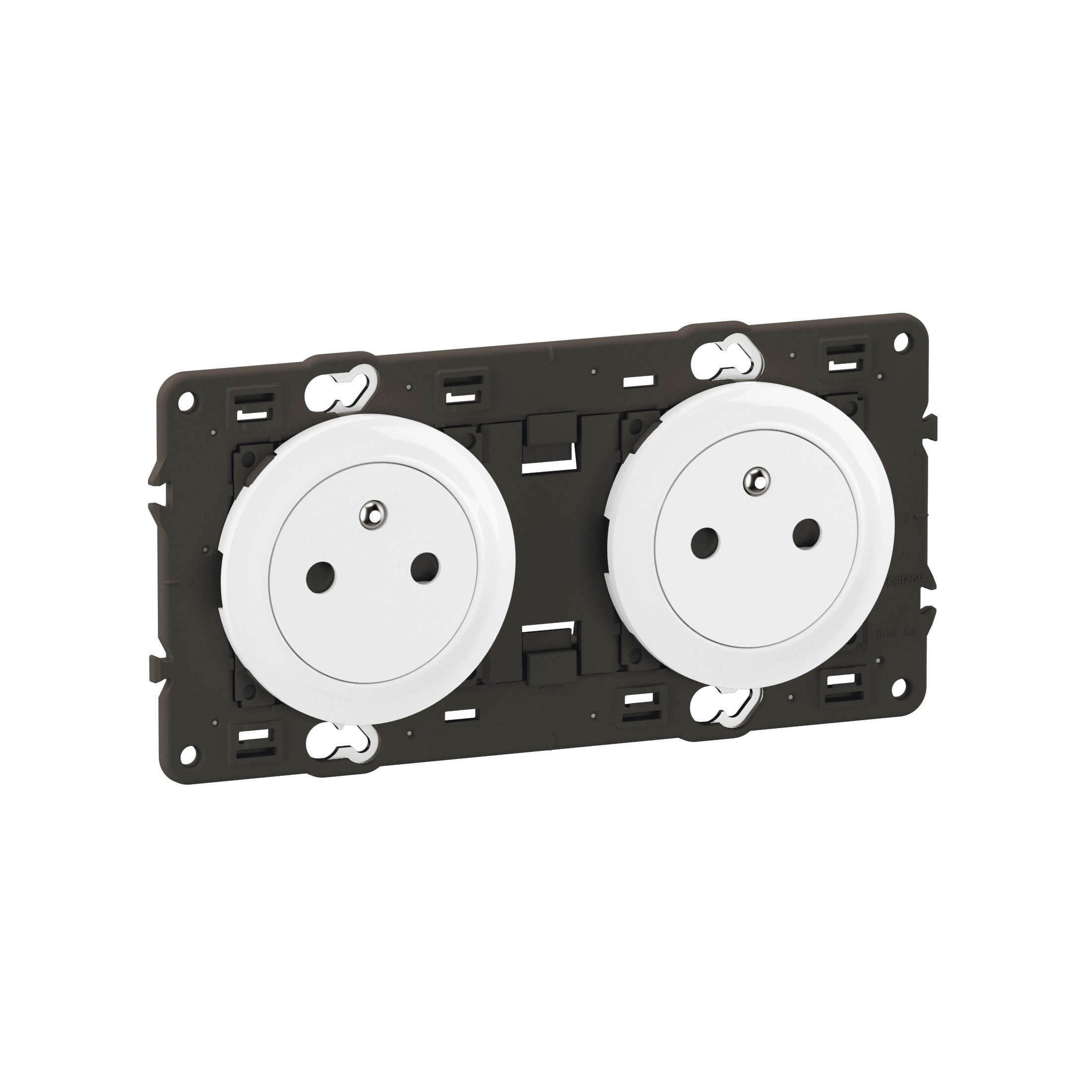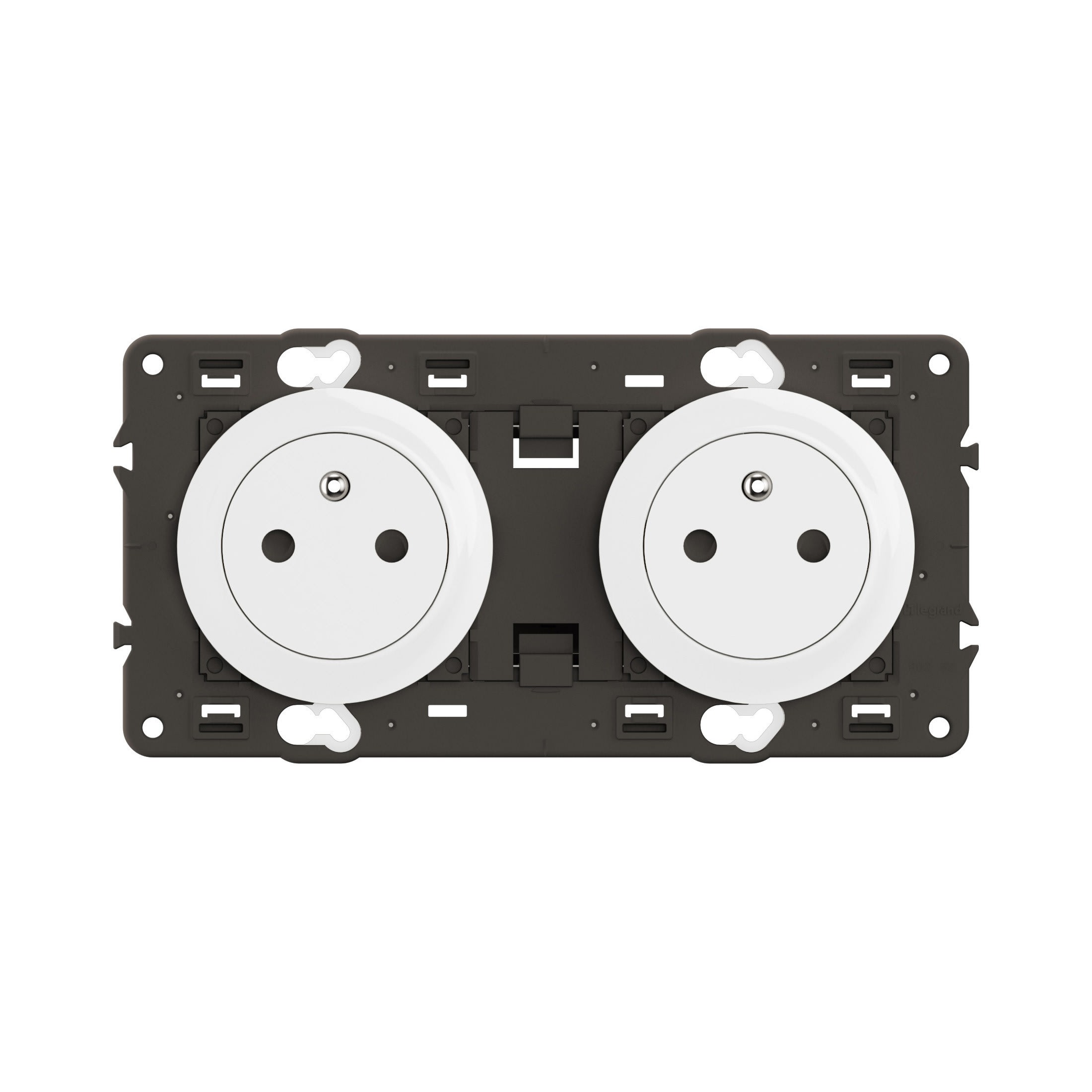 Double prise 2P+T précâblée Surface Confort Céliane - livrée avec enjoliveurs Blanc et support montés, à équiper d'une plaque de finition 2 postes