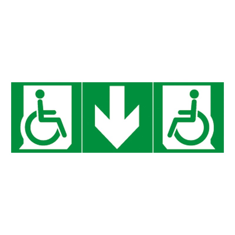 Etiquette de signalisation universelle d'évacuation avec 2 silhouettes de personne en fauteuil roulant (de profil), et une flèche directionnelle droite - adhésive, sécable et transparente visible depuis une distance de 20m