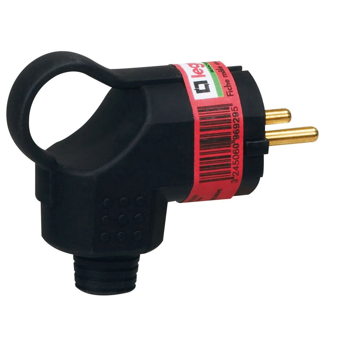 Fiche borne à vis 2P+T 10A - 16A : Ø4,8mm - Sortie latérale à anneau - standard français et germanique - Matière caoutchouc IK08 : résistance à un choc de 5 joules Franco-belge Etiquette avec Gencod