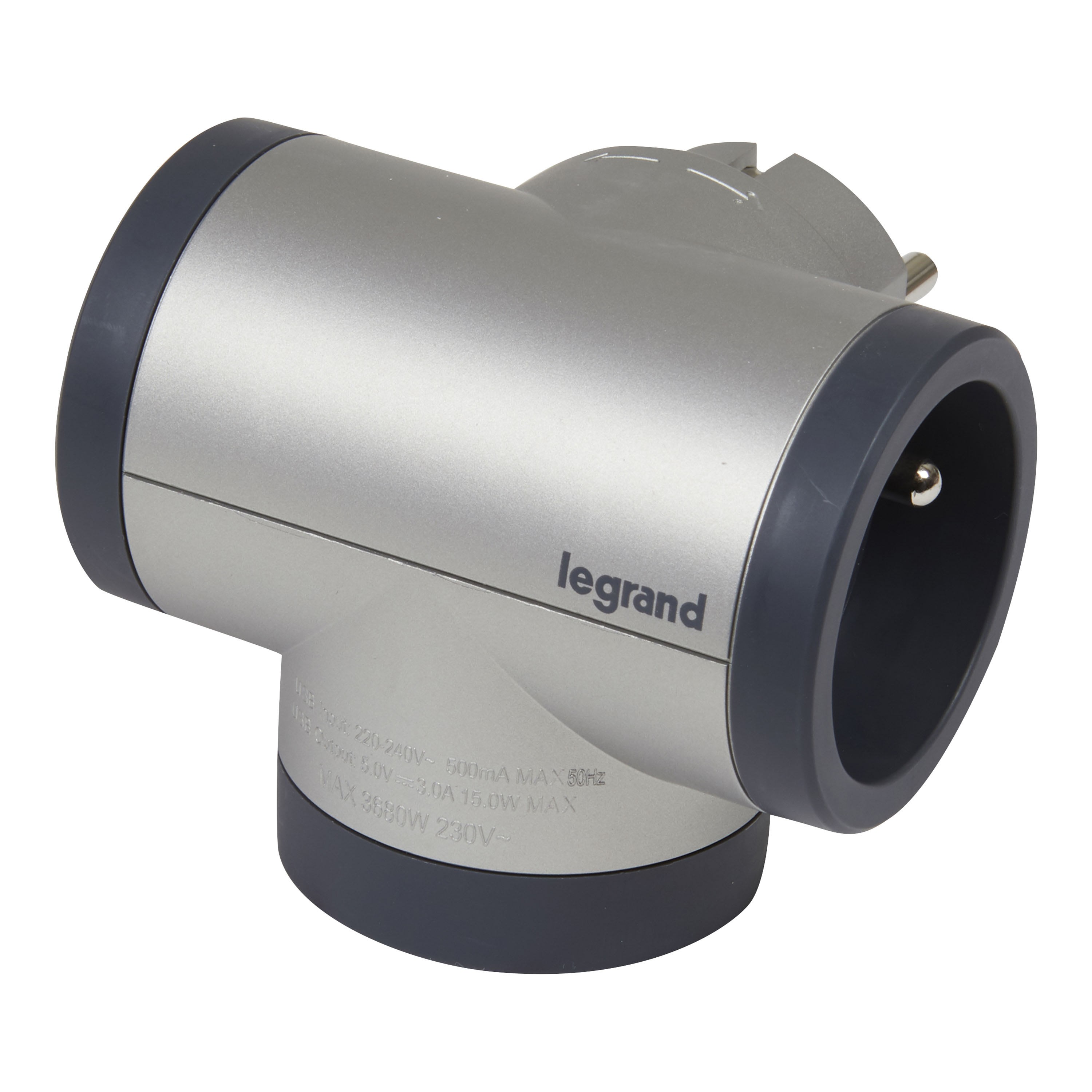Fiche multiprise avec 2 prises de courant 2P+T pour branchement sur les côtés (latérales) et 1 prise USB pour branchement par le dessous ou le dessus Avec prise USB Type-A + Type-C 3A 15W pour recharger les smartphones, tablettes et autres appareils électroniques 16A 230V 3680W maximum - Avec éclips de protection pour protection enfant Finition aluminium/gris foncé A brancher sur une prise murale 2P+T