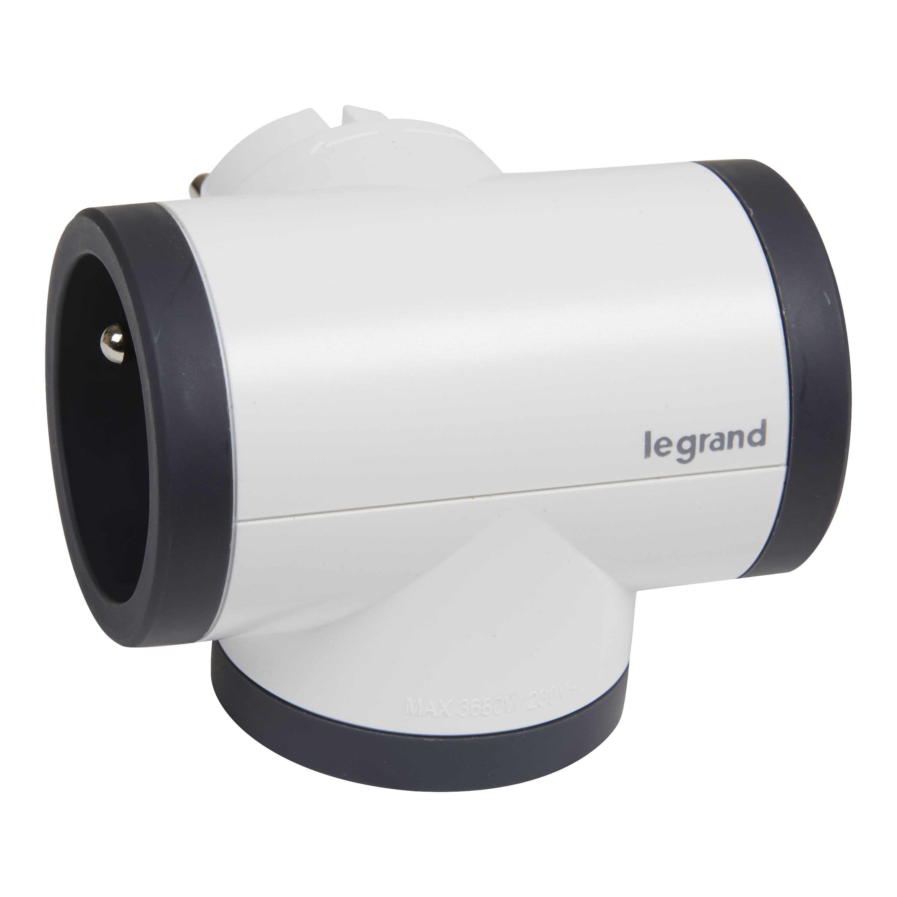 Fiche multiprise avec 3 prises de courant 2P+T : 2 prises pour branchement sur les côtés et 1 prise pour branchement par le dessous ou le dessus 16A 230V 3680W maximum Avec éclips de protection pour protection enfant Finition blanc/gris foncé A brancher sur une prise murale 2P+T