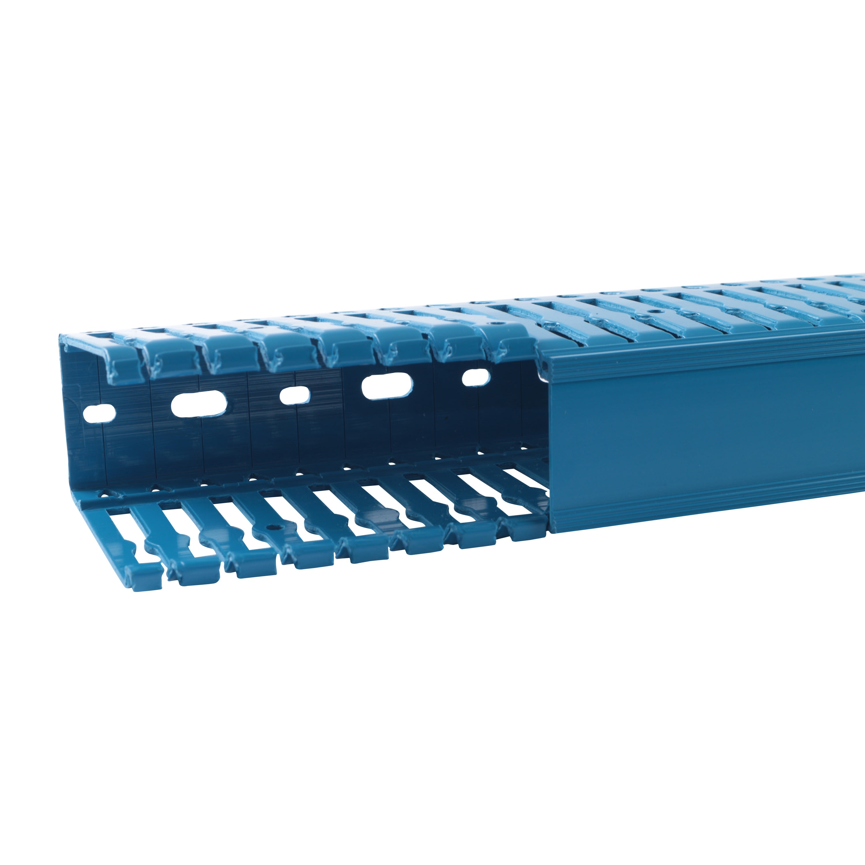 Goulotte sans halogène Bleu - PC/ABS Dimensions : - Largeur 40mm- Hauteur 80mm- Perforations latérales au pas de 12,5mm (6/6,5)- Présenté en longueur de 2m Bandes blanches sur couvercle pour repérage par gravure ou écriture au feutre indélébile Conforme à la norme EN 50085-2-3