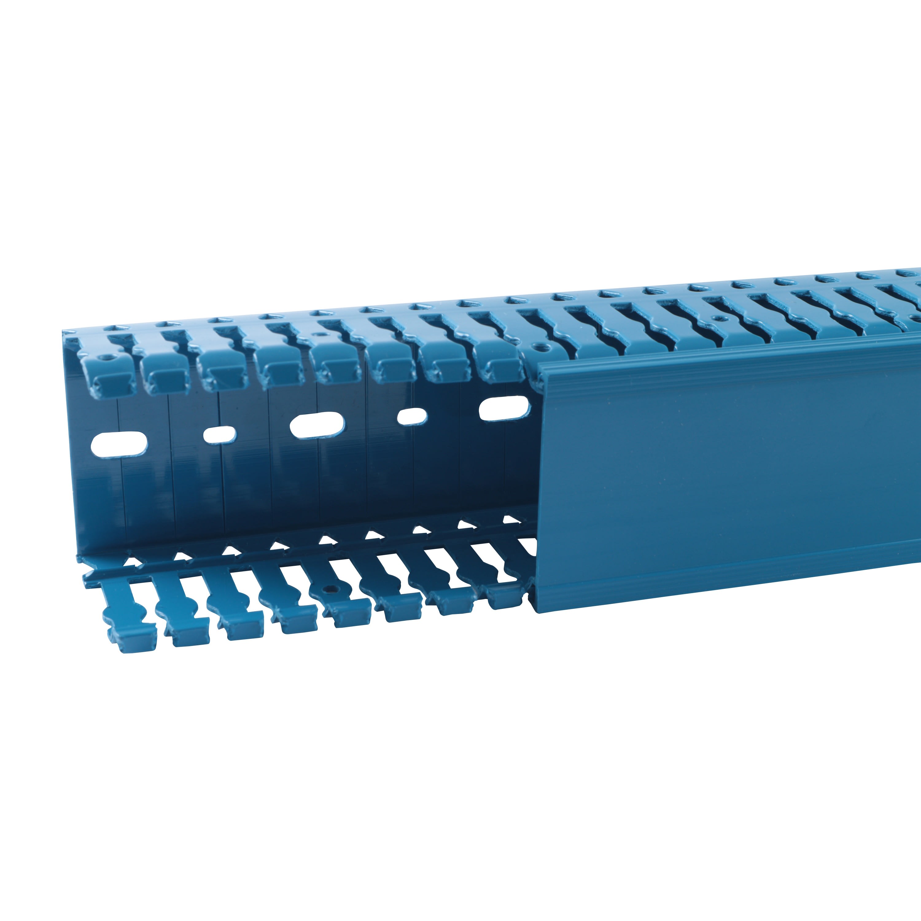 Goulotte sans halogène Bleu - PC/ABS Dimensions : - Largeur 60mm- Hauteur 60mm- Perforations latérales au pas de 12,5mm (6/6,5)- Présenté en longueur de 2m Bandes blanches sur couvercle pour repérage par gravure ou écriture au feutre indélébile Conforme à la norme EN 50085-2-3