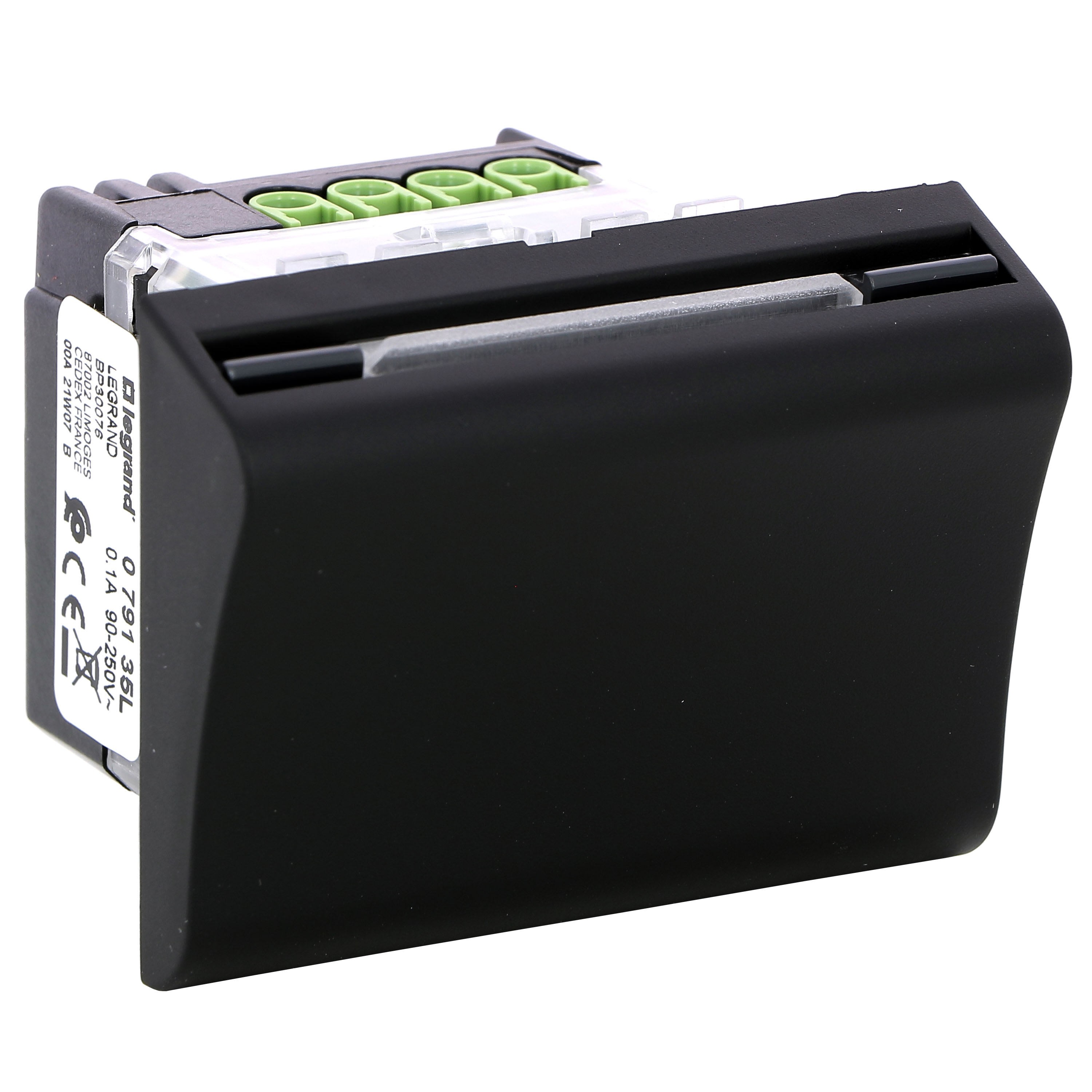 Temporisation de 30 s après retrait de la carte Contact 230 V/30 VA Connexion par bornes automatiques à levier permettant la connexion rapide sans outil Zone d'insertion du badge rétro-éclairée Noir mat