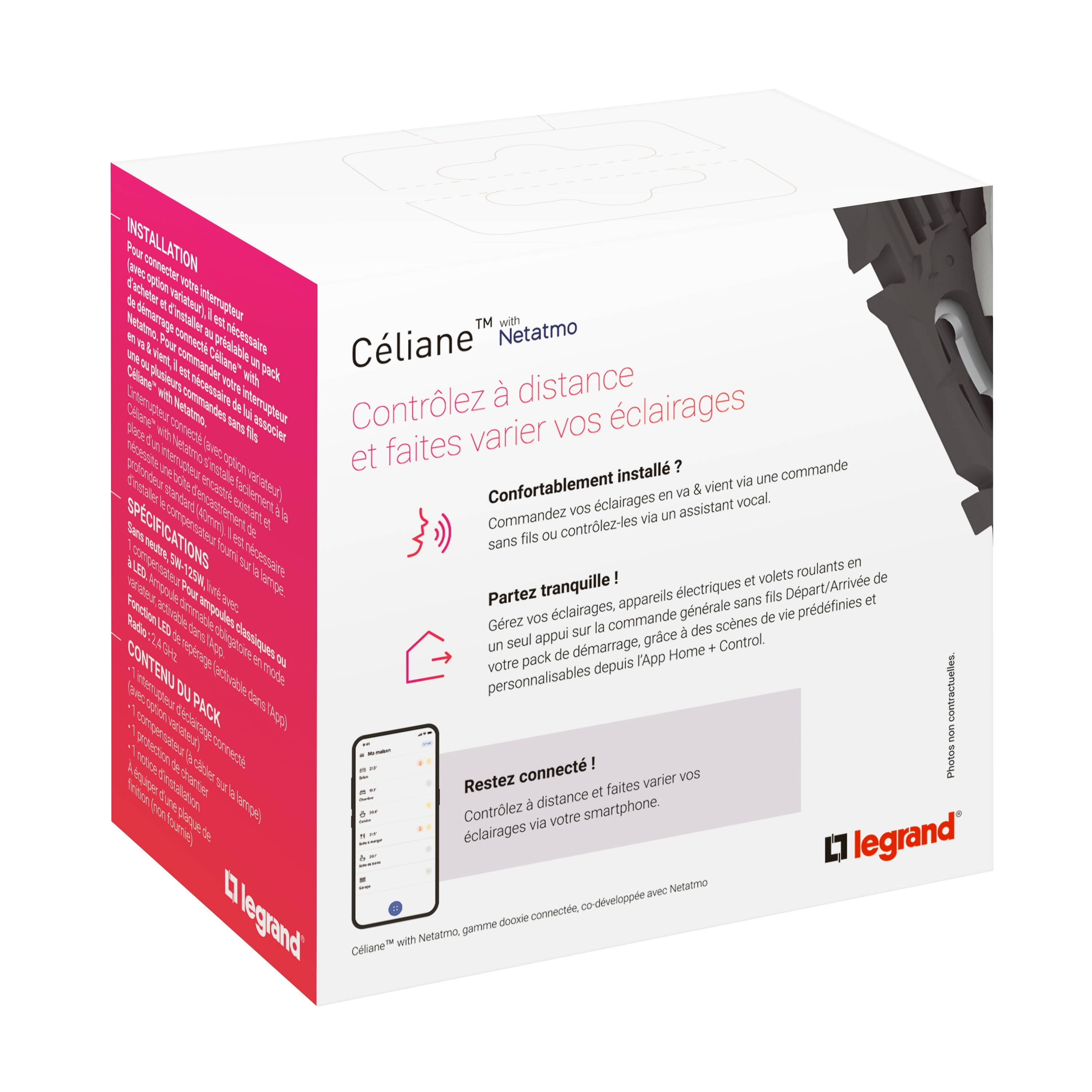 Céliane™ with Netatmo permet d’installer des fonctions connectées dans les logements. Reconnaissables grâce au motif effet diamant autour du doigt, les interrupteurs et commandes Céliane™ with Netatmo gardent un design en accord avec le reste de l’appareillage Céliane™. Cette version connectée permet de contrôler l'éclairage, les volets roulants et les appareils électriques manuellement via un interrupteur ou une commande sans fils, à distance via l’App. Home + Control ou par la voix avec les assistants vocaux (Apple Home, Amazon Alexa, Google Home). Vous pouvez suivre précisément vos consommations dans l’application pour garder une maîtrise sur vos dépenses énergétiques et ainsi, réaliser des économies d’énergie. La version connectée Céliane with Netatmo permet de contrôler en local ou à distance les éclairages, volets roulants, chauffage et autres appareils électriques depuis un smartphone ou via un assistant vocal. Les solutions connectées Céliane™ with Netatmo permettent de mesurer, agir et piloter les appareils électriques connectés pour mieux gérer les consommations d’énergie et faire des économies.