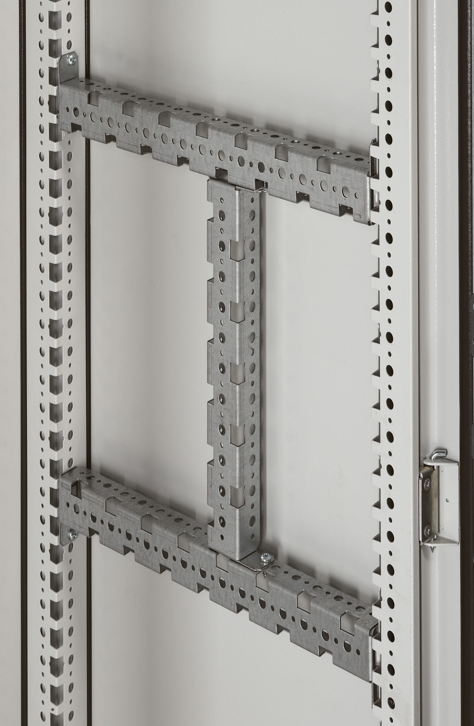 Jeu de 2 traverses perforées multifonctions - Acier galvanisé Pour armoire Altis largeur ou hauteur ou profondeur 400mm Perforations pour clips écrou au pas de 25mm Permet la réalisation de châssis partiels dans les armoires assemblables