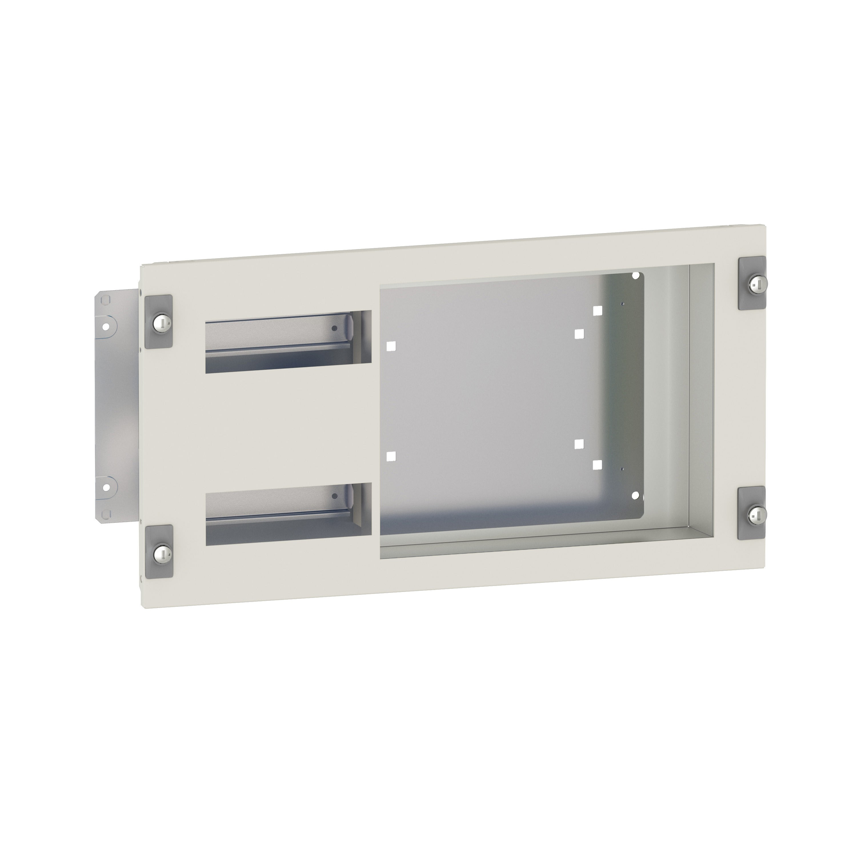 Livré avec : 1 platine de fixation équipée de 2 rails de 8 modules, 1 plastron dédié hauteur 300mm Plastron métal équipé de 1/4 tour plombables à 2 positions (ouvert, fermé) Platine pour disjoncteur de branchement à commander séparément Revêtement époxy polyester RAL7035