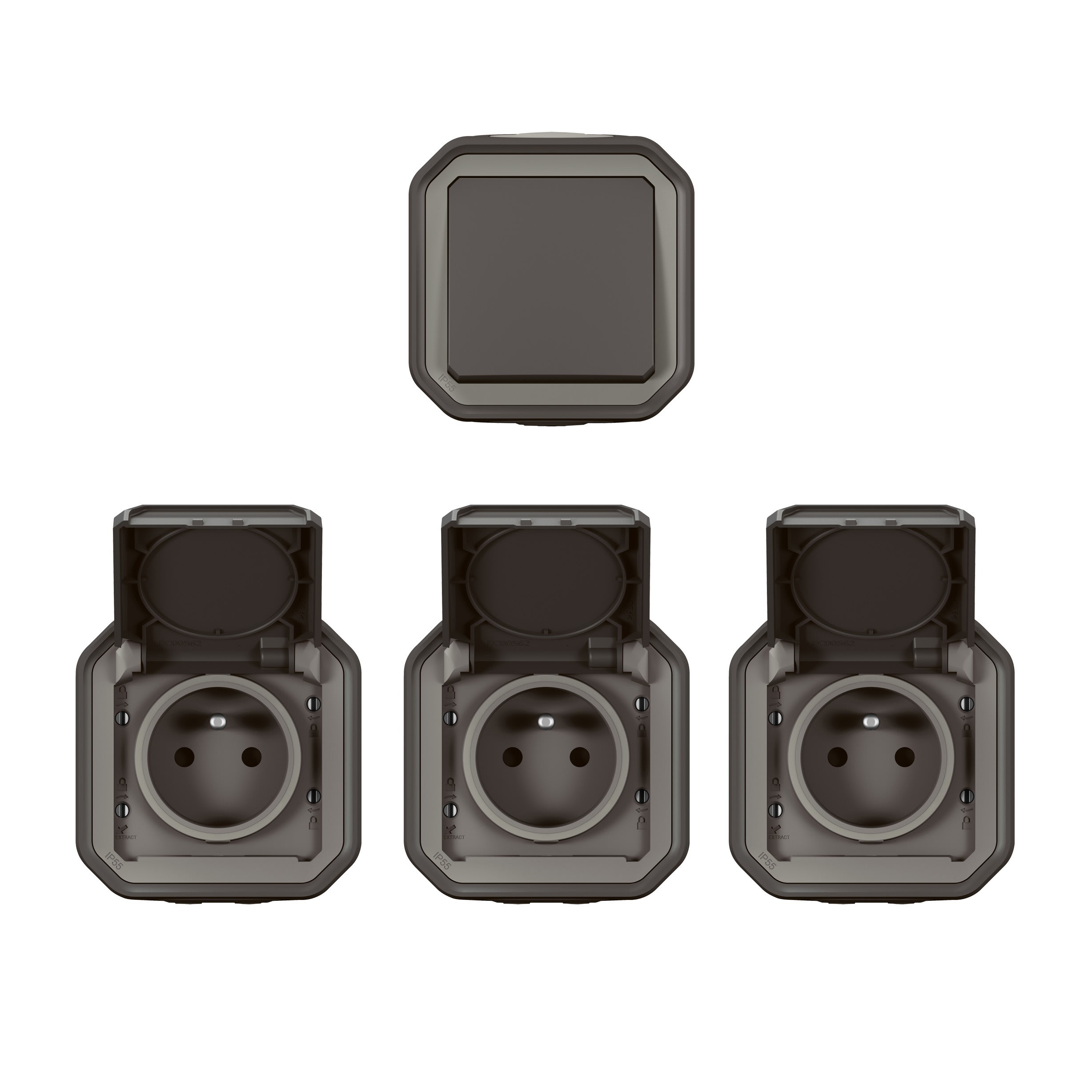 Produits complets, prêts à être installés en saillie IP55 : protégé contre les poussières et les projections d'eau à la lance de toutes directions. IK08 : résistance à un choc de 5 joules. Interrupteur / va-et-vient 10AX. Connexion rapide sans outil avec repérage couleur. Prise de courant 2P+T 16A 250V. Connexion rapide sans outil avec repérage couleur.