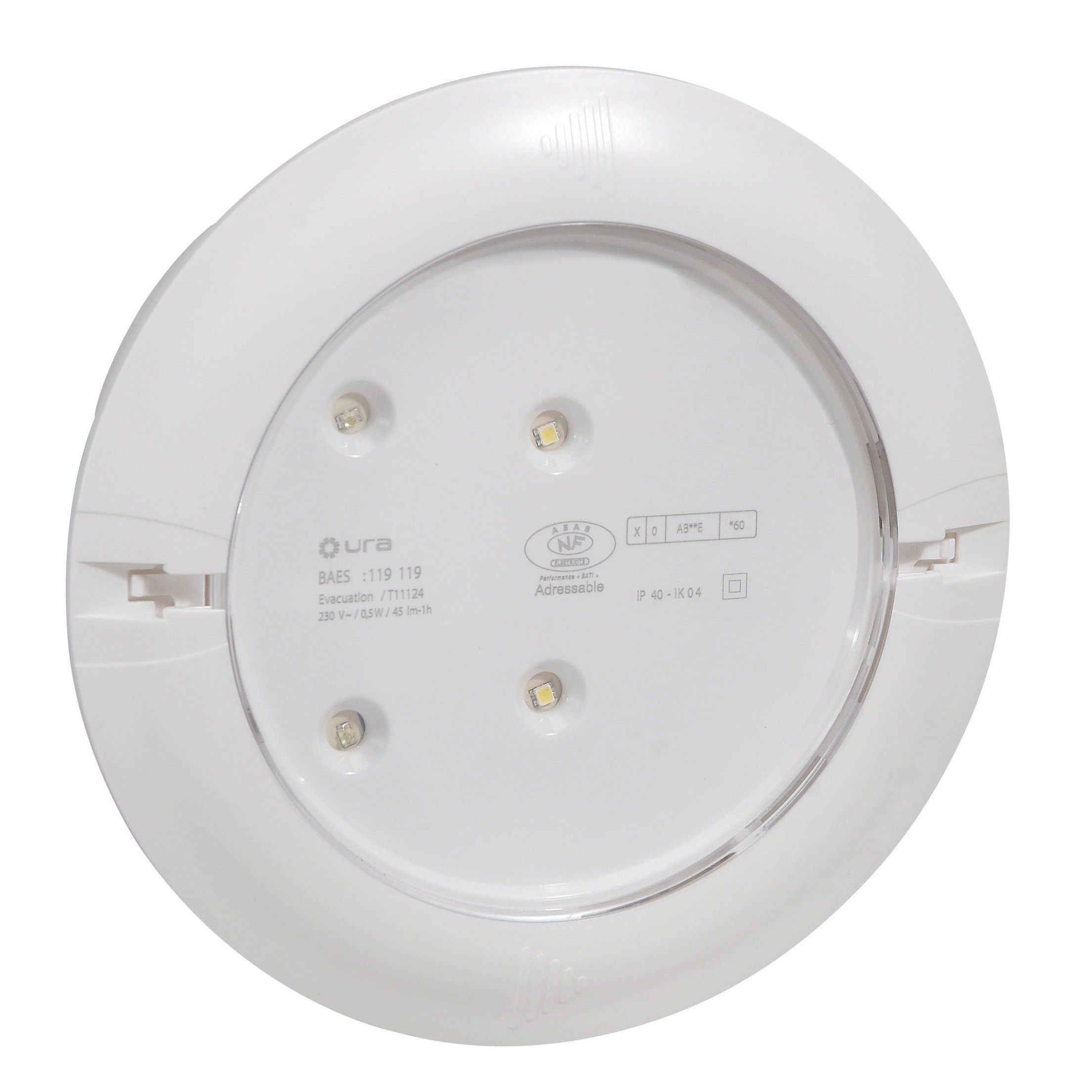 Luminaire rond encastrable pour source centralisé d'évacuation Kickspot 45 lumens IP40 IK04 plastique à LEDs - tension 24V= à 48V= - certifié NF AEAS LSC et NF environnement