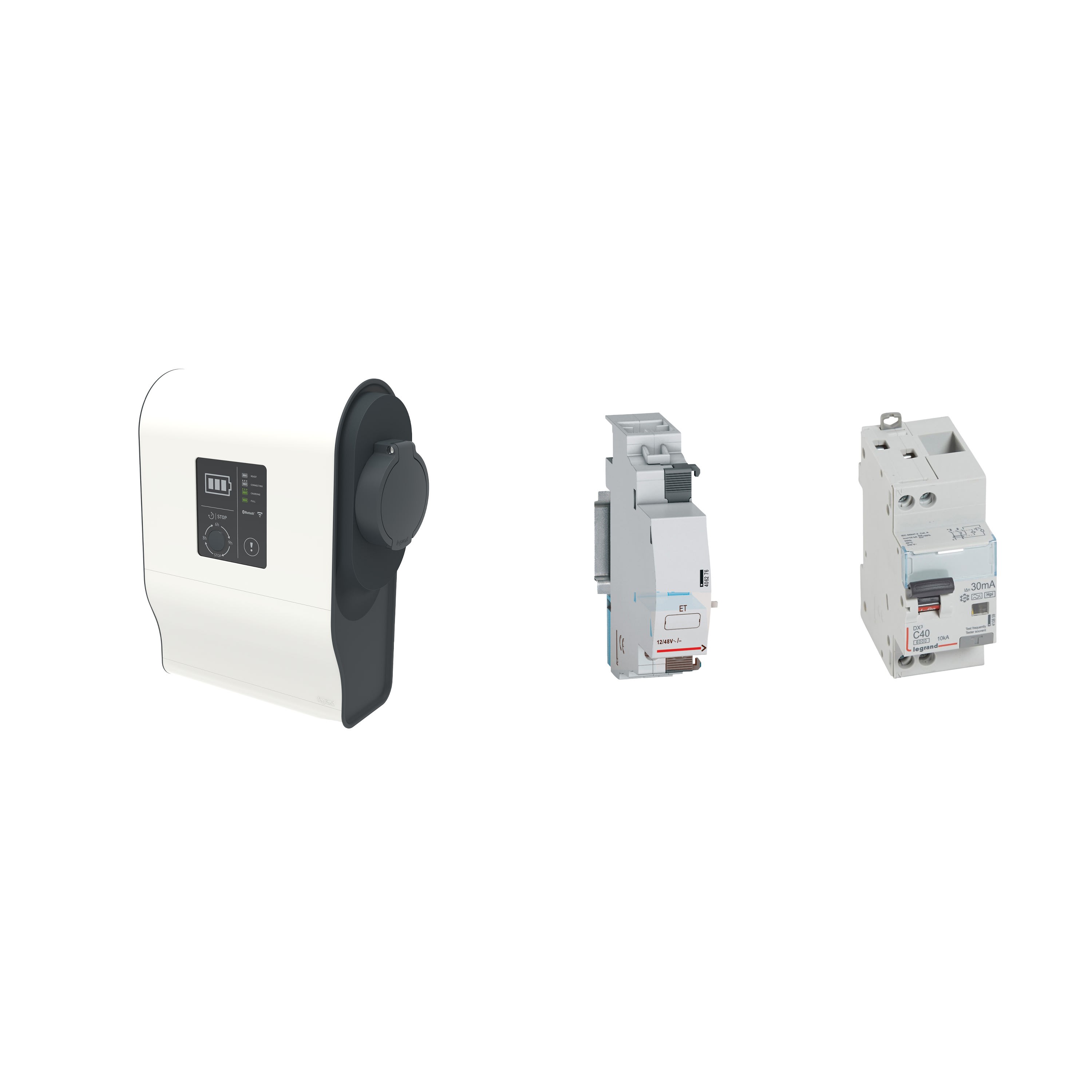 Pack borne VE composé de :- 1 borne monophasée plastique avec protection référence 058001- 1 disjoncteur différentiel 1P+N 40A TypeF 30mA référence 410859- 1 déclencheur à émission de tension DX³ 12V à 48V référence 406276 Communication :- sans fils, en local par Bluetooth : configuration et pilotage de la borne par smartphone, tablette via l'application EV Charge Light- IP filaire ou Wi-Fi avec un kit de communication en option Possibilité de pilotage horaire ou heures creuses par commande type contacteur, horloge, interrupteur (entrée contact sec 12 V=) ou via planning