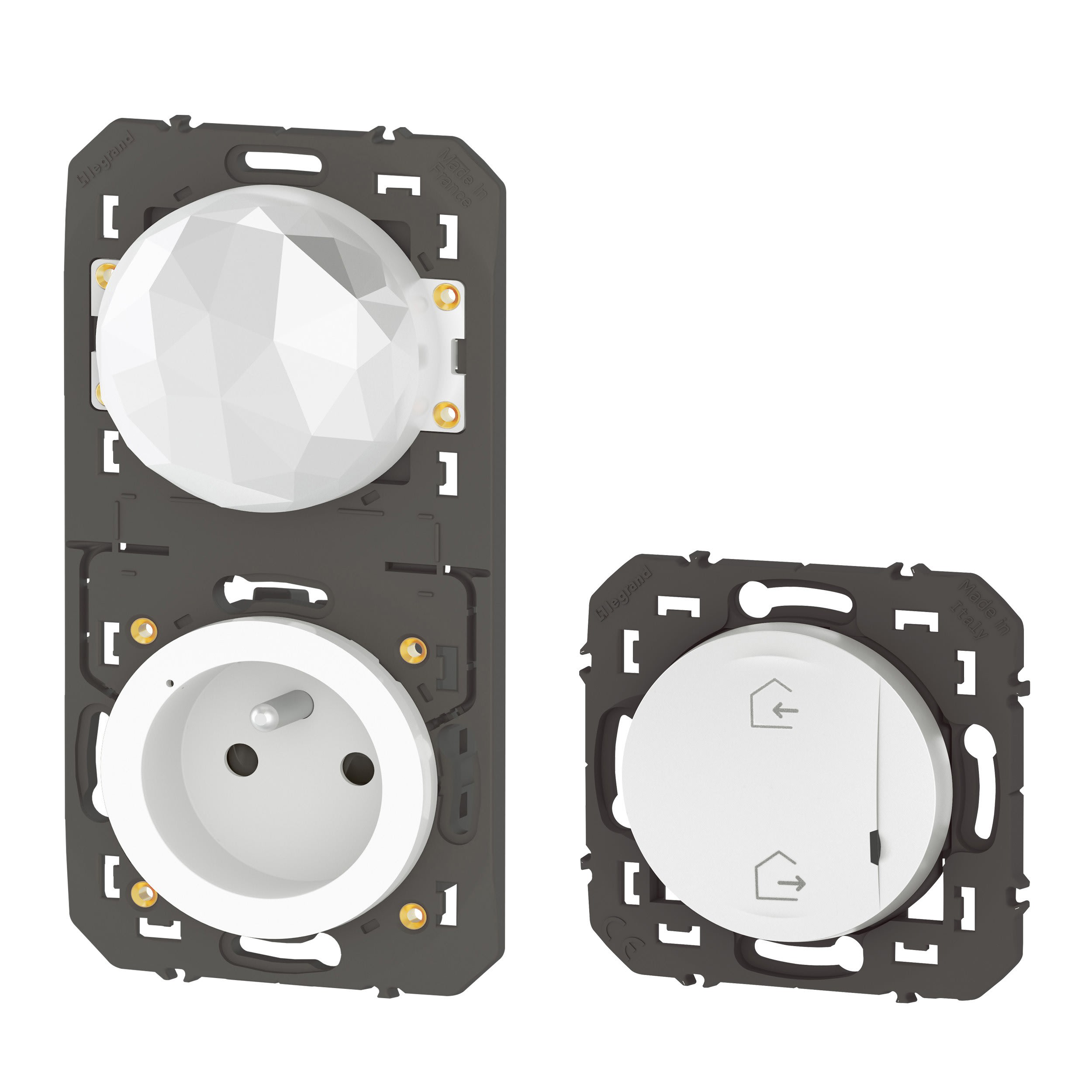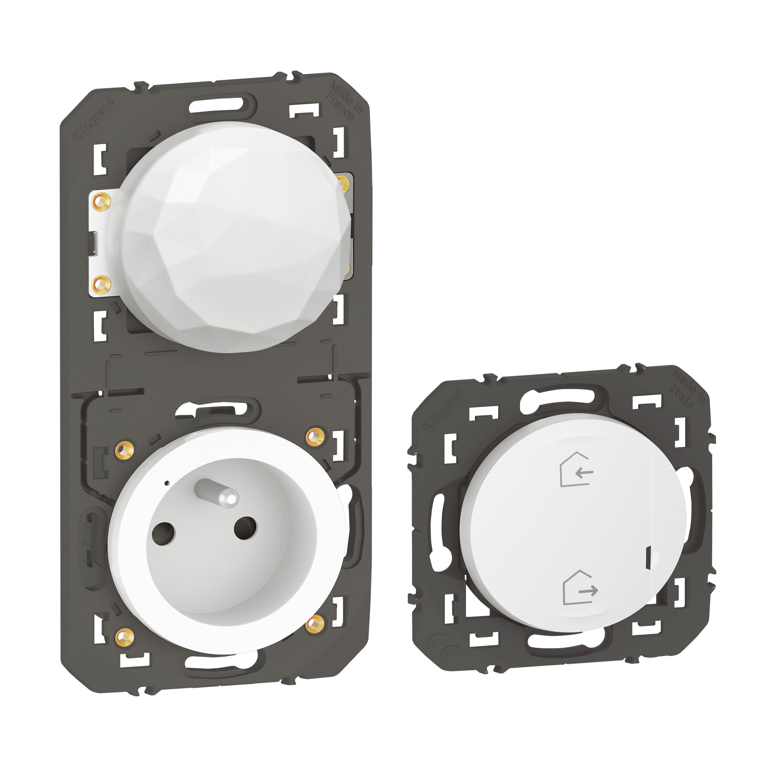 Prise Control :- Mesure la consommation électrique instantanée et cumulée- Protège contre les surcharges, coupure à 16A maximum- Compatible avec tout appareil électrique et gros électroménager- Voyant LED avec fonction de repérage activable dans l'App.- WiFi 2,4 GHz 802.11 b/g/n Commande générale sans fils Départ/Arrivée : Scénarios Départ/Arrivée prédéfinis et personnalisables depuis l'App. Home + Control - Livrée avec une pile remplaçable d'une durée de vie de 8 ans - Voyant LED avec indicateur de batterie faible L'installation de la prise Control se fait facilement en lieu et place d'une prise standard existante dans une boîte 1 poste de profondeur 40mm avec ou sans griffes La commande générale départ/arrivée sans fils est fournie avec une pile d'une durée de vie de 8 ans - Cette pile est changeable - Une alerte de fin de vie de pile est disponible dans l'application Blanc