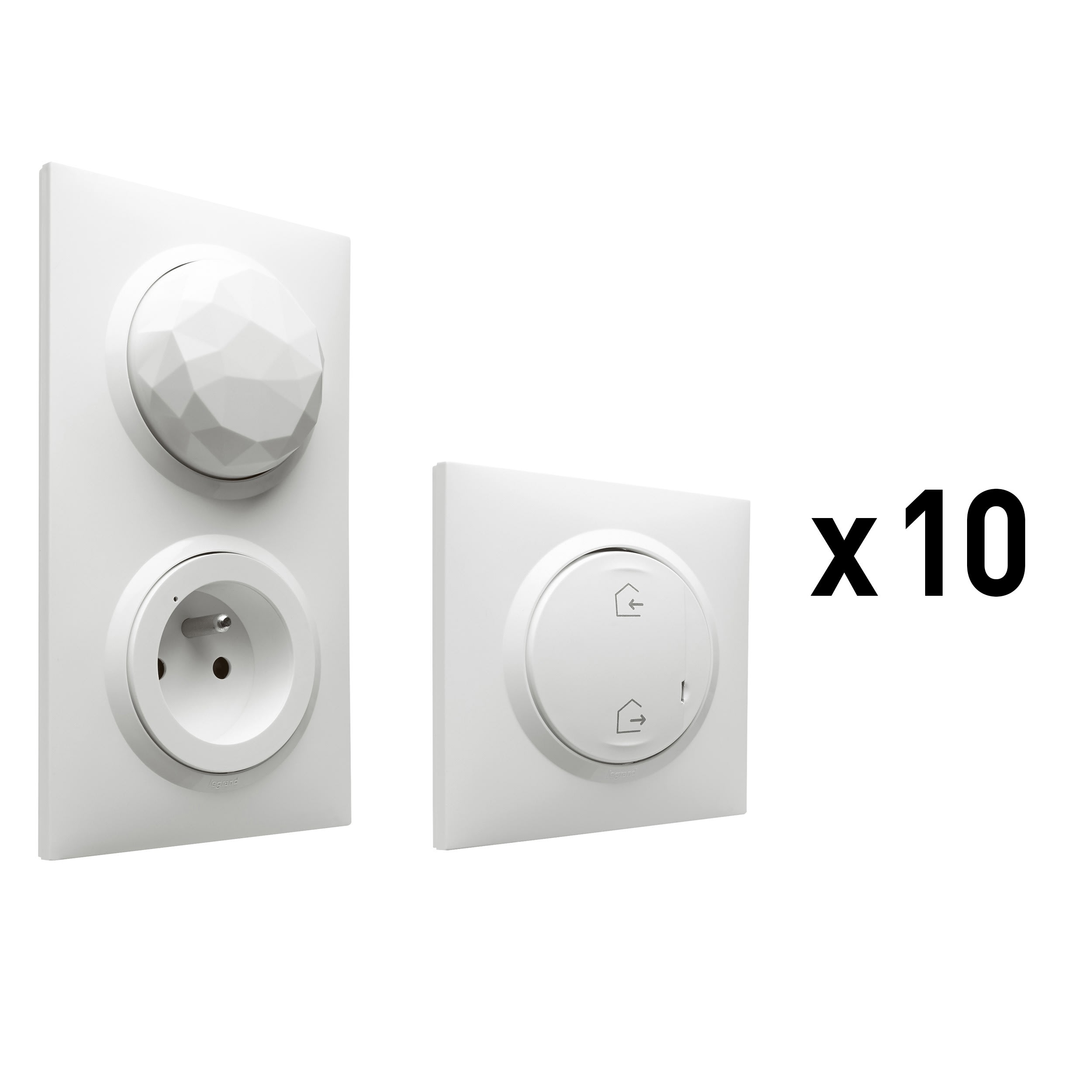 Lot de 10 packs de démarrage dooxie with Netatmo avec 1 prise de courant encastrée et connectée avec passerelle + 1 commande sans fils Départ/Arrivée - livrés complets avec supports, protections de chantier, enjoliveurs et plaques blanc