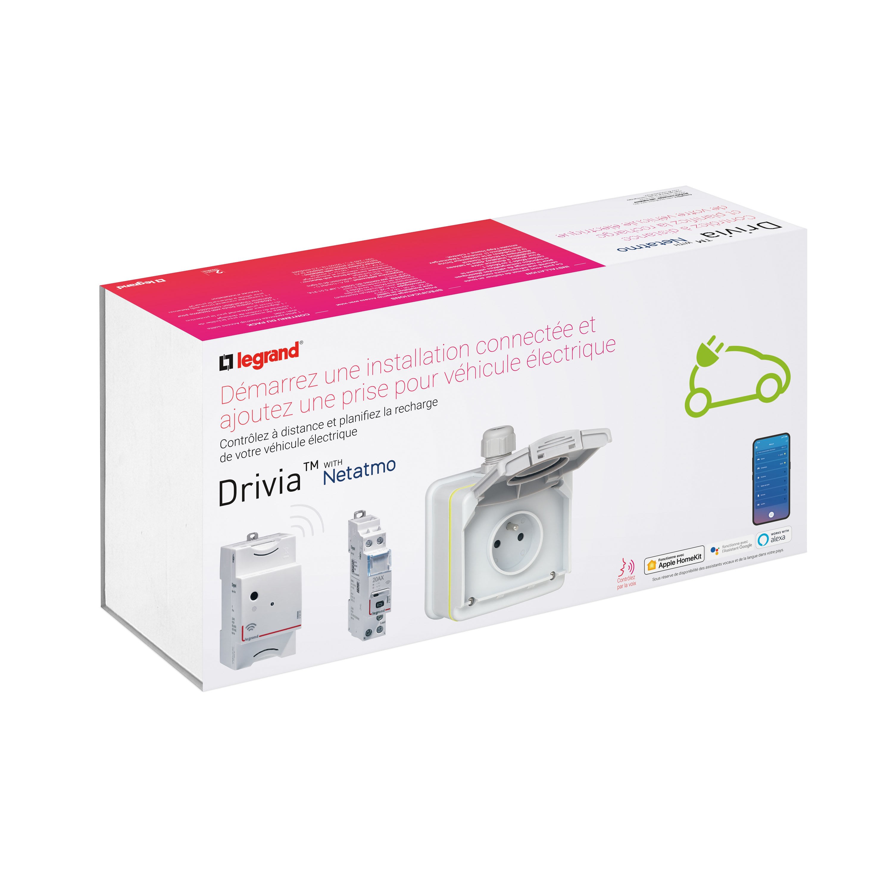 Pack de démarrage Green'up Access connecté composé de :- 1 prise renforcée Green'up Access plastique (pour installation en saillie) avec volet, IP66- IK08- 16A homologuée 230V- 16A véhicule électrique- 1 patère de suspension référence 090478 pour le boîtier de contrôle du cordon de recharge- 1 disjoncteur différentiel 20A- courbe C- 30mA- typeF (ex Hpi) référence 410754- 1 pack de démarrage connecté pour tableau électrique référence 412191 Prise Green'up Access, capacité de raccordement 6mm², conforme aux normes IEC 60884-1, NF C 61-314, VDE 620-1 Pack de démarrage Drivia with Netatmo composé de :- 1 module Control 100V~ à 240V~ - 50Hz à 60Hz référence 412181- 1 contacteur connecté multifonction, silencieux 20AX - 230V~ - 50Hz référence 412171- Permet la configuration en mode off-line (sans internet) grâce à l'App Home + Pro Peut être complété par les packs Extension connectés ou les produits connectés Convient aux lieux de vie type maison individuelle