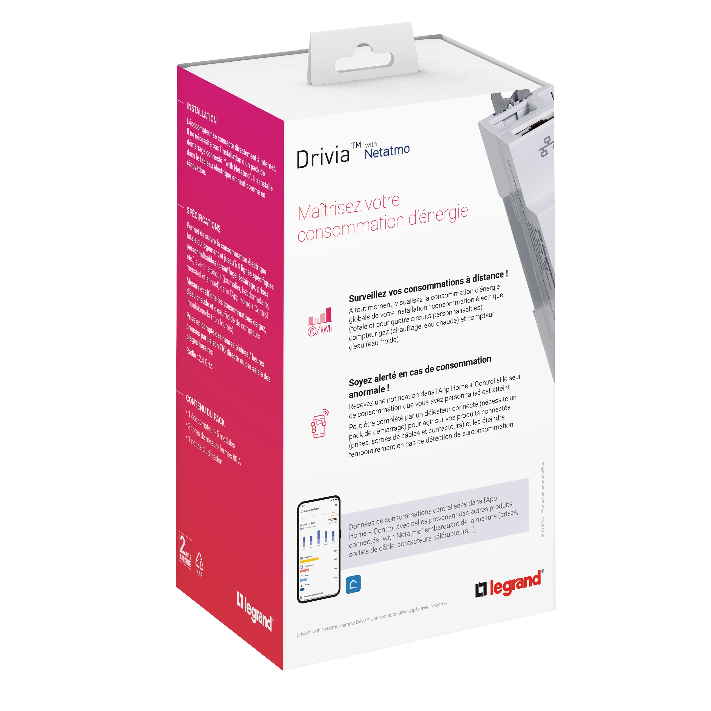 Drivia™ with Netatmo propose des produits modulaires connectés à installer directement dans le tableau électrique, compatibles avec l'application Home + Control et les principaux assistants vocaux. Ces fonctions permettent de contrôler la production et la consommation d'énergie et de réduire la facture grâce aux fonctionnalités de gestion et contrôle de l'énergie. La mise en oeuvre est simple avec un câblage classique et intuitif avec l'appairage des autres fonctions with Netatmo
